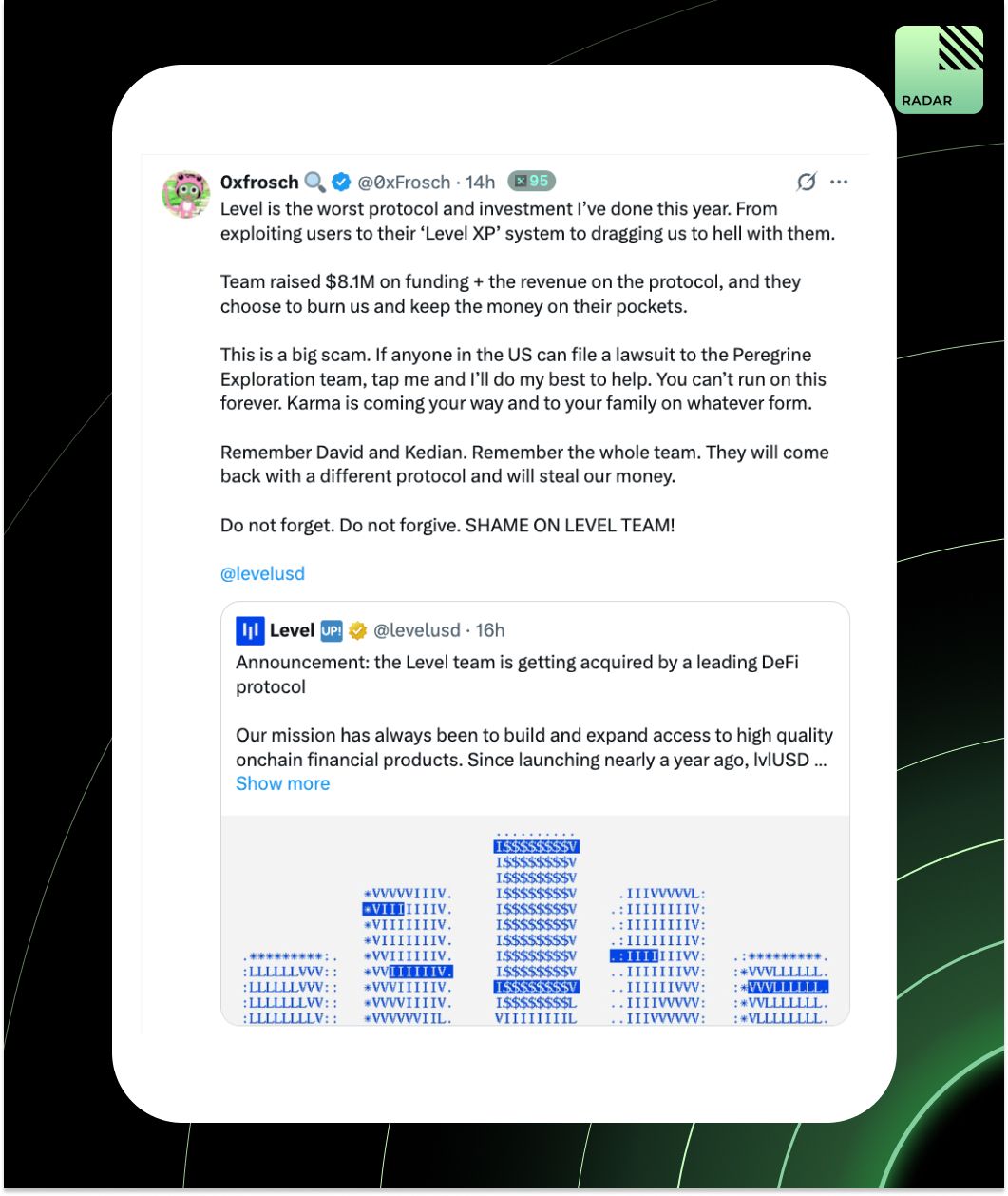 Level is shutting down after an acquisition, offering 1:1 redemptions and fast unstaking until December. Critics accuse the team of pocketing funding while abandoning users, calling it a scam and warning they’ll rebrand to strike again.