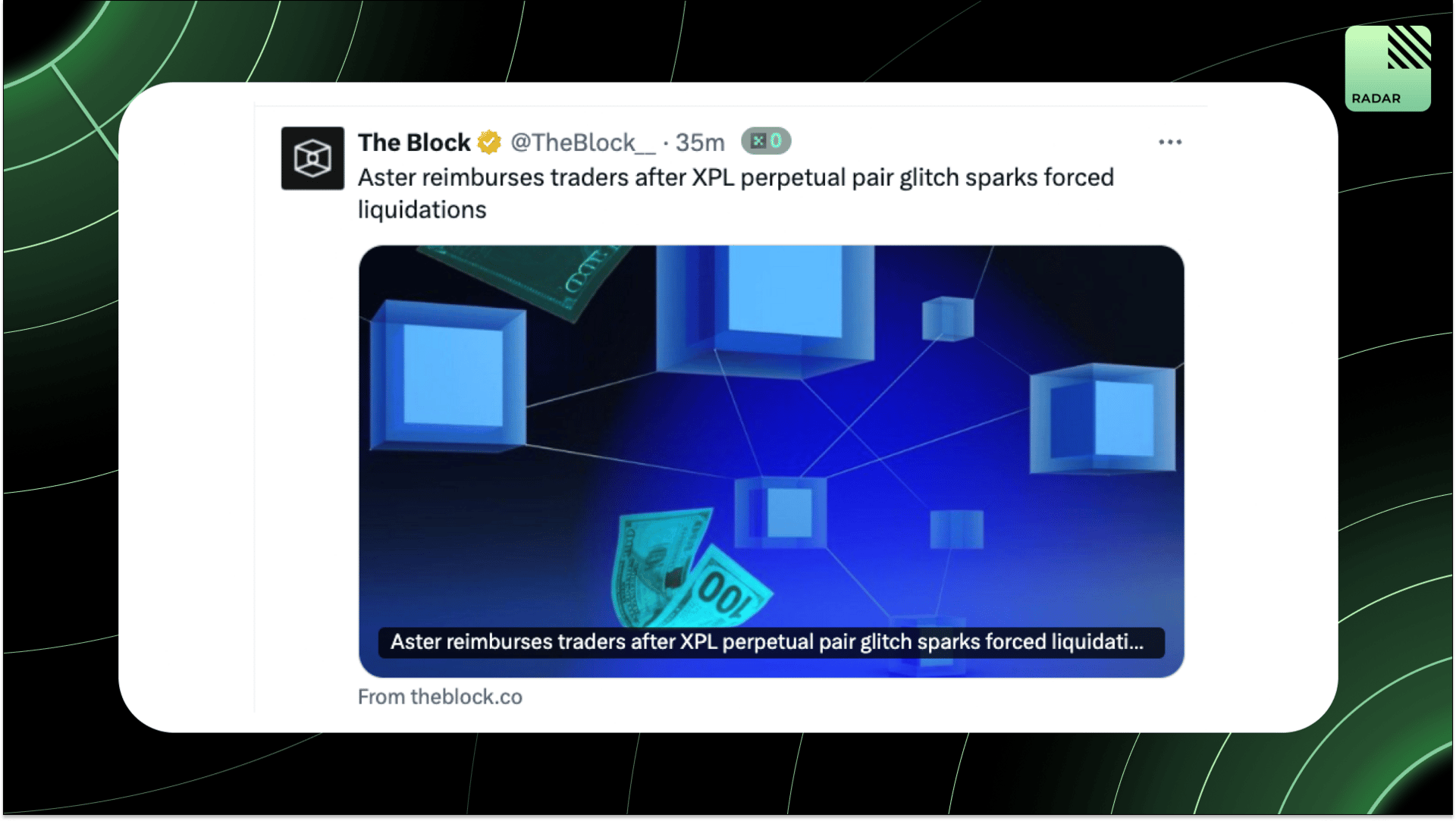 Aster reimbursed traders liquidated after an XPL perp glitch that spiked prices to $4. The issue, tied to safeguard removal during Plasma’s token launch, was resolved within hours, with USDT payouts covering losses and fees.