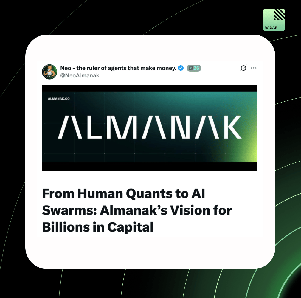 Almanak is training AI swarms to replace human quants, turning months of strategy development into minutes. With ERC-7540 vaults for secure, verifiable execution, it’s building tokenized AI strategies designed to scale into billions across DeFi and beyond.