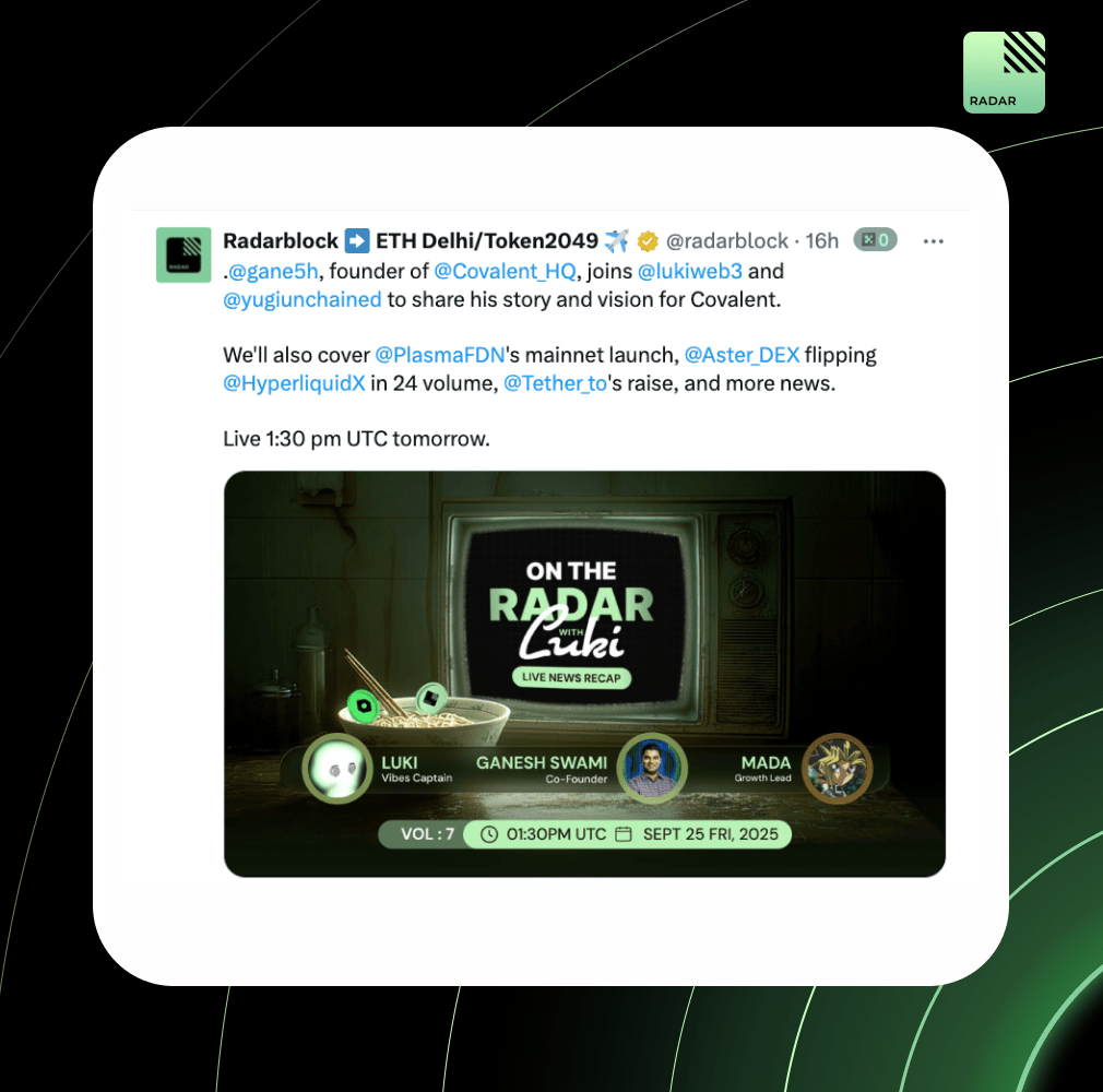 We are going live today at 1:30 PM UTC with Ganesh, founder of Covalent, alongside Luki and Yugi from Radarblock. Expect Covalent’s story plus coverage on Plasma’s mainnet, Aster flipping Hyperliquid, Tether’s raise, and more.
