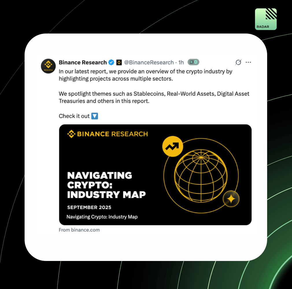 Binance’s new Industry Map breaks down the 2025 crypto stack into 7 verticals, from stablecoins and DATs to DeFi, RWAs, and gaming infra. Each segment spotlights top projects across functions like issuance, payments, privacy, and more.