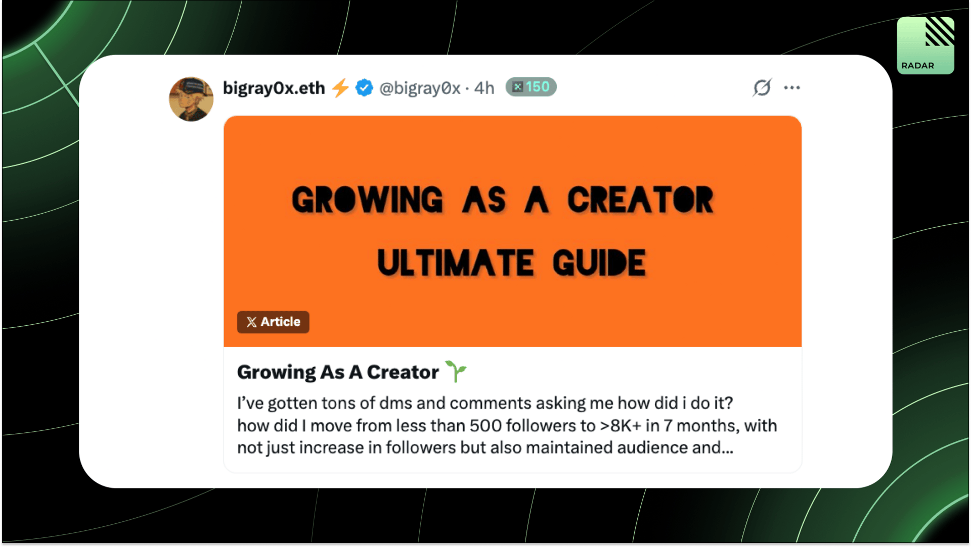 From 500 to 8K+ followers in 7 months, Bigray breaks down the formula: show real results, master your niche, and post value daily. Branding, consistency, and verified engagement helped turn his X into a growth engine, supported by a clear niche and frequent posting.