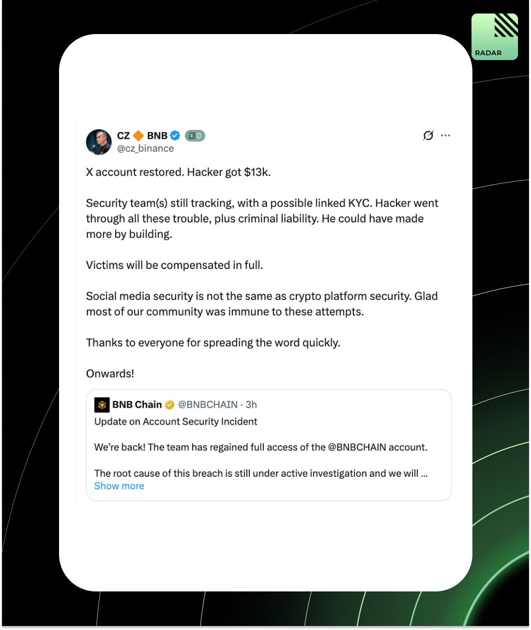 BNB’s X account was compromised, resulting in ~10 phishing links being posted and $8K in total user losses, $6.5K of which came from a single victim. The attacker also deployed a phishing contract, netting ~$4K in profit. BNB Chain has committed to reimbursing victims, with an investigation underway