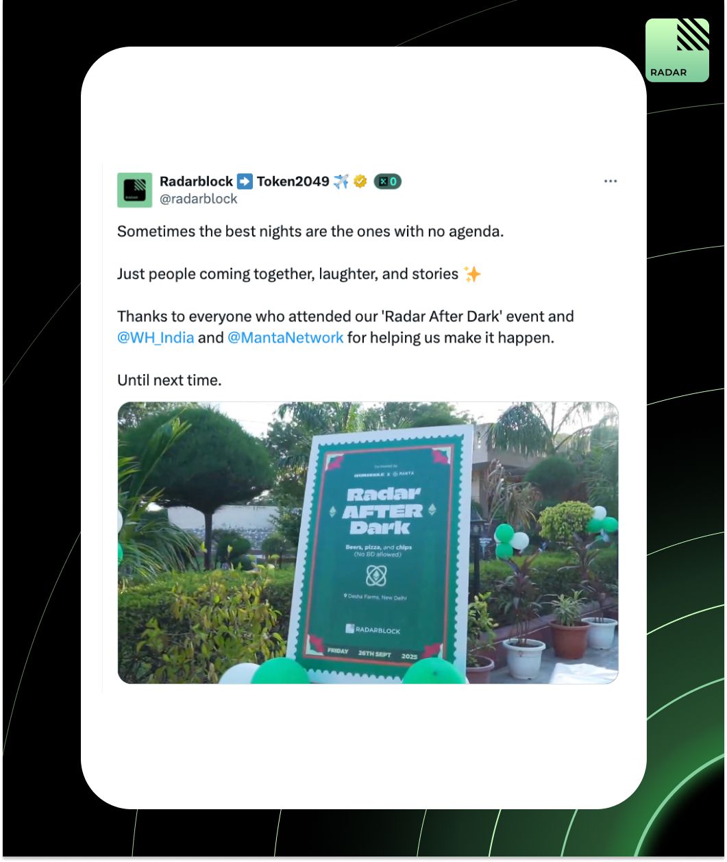 Radar After Dark wasn’t about panels or pitches; it was vibes, stories, and spontaneous connections. Radarblock, Manta, and Wormhole India brought the right people together.