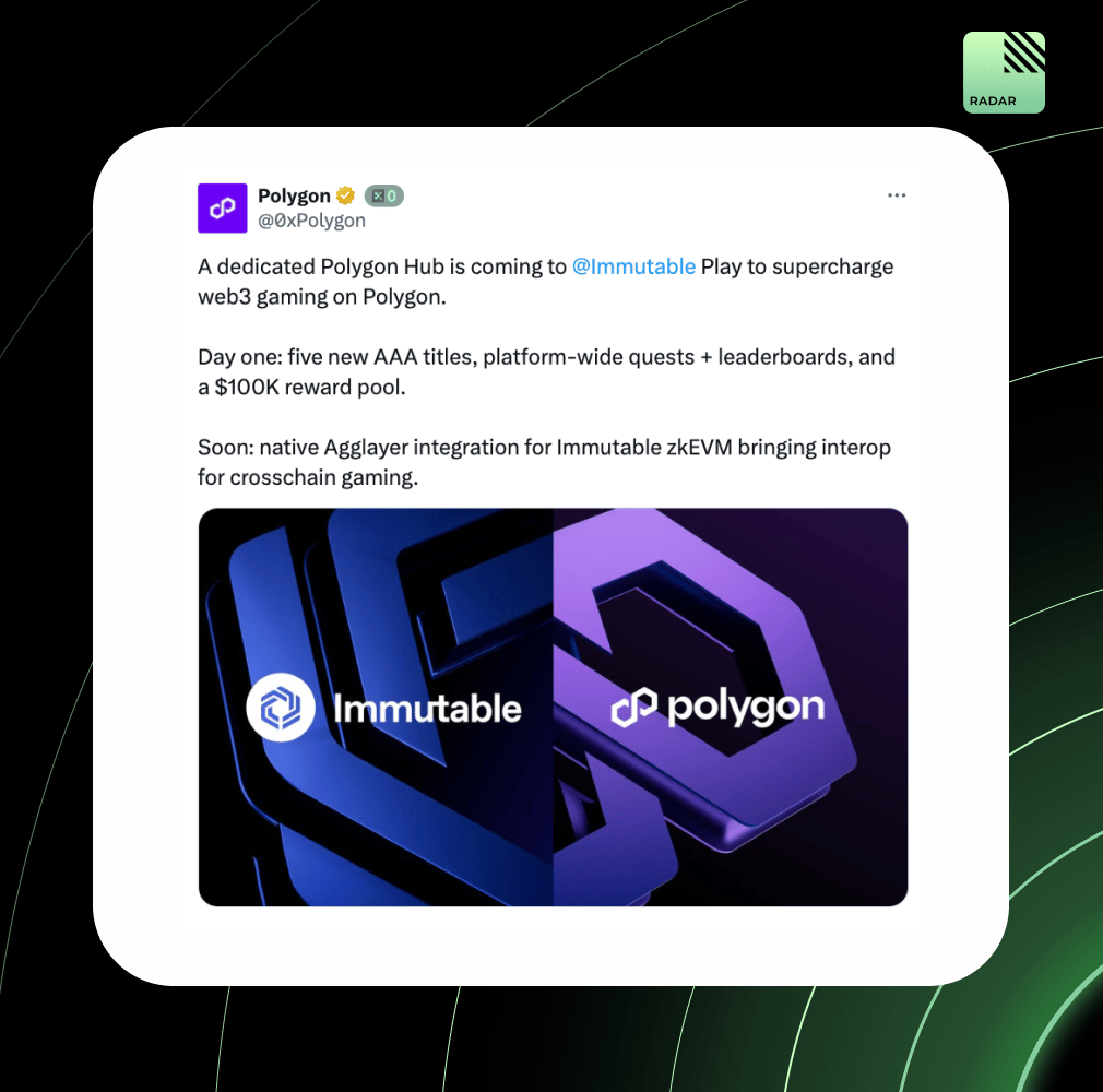 Polygon and Immutable are launching a dedicated Polygon Hub on Immutable Play, kicking off with 5 AAA games, $100K in rewards, and platform-wide quests. Soon, Agglayer integration will unlock seamless cross-chain gaming across the Polygon ecosystem.
