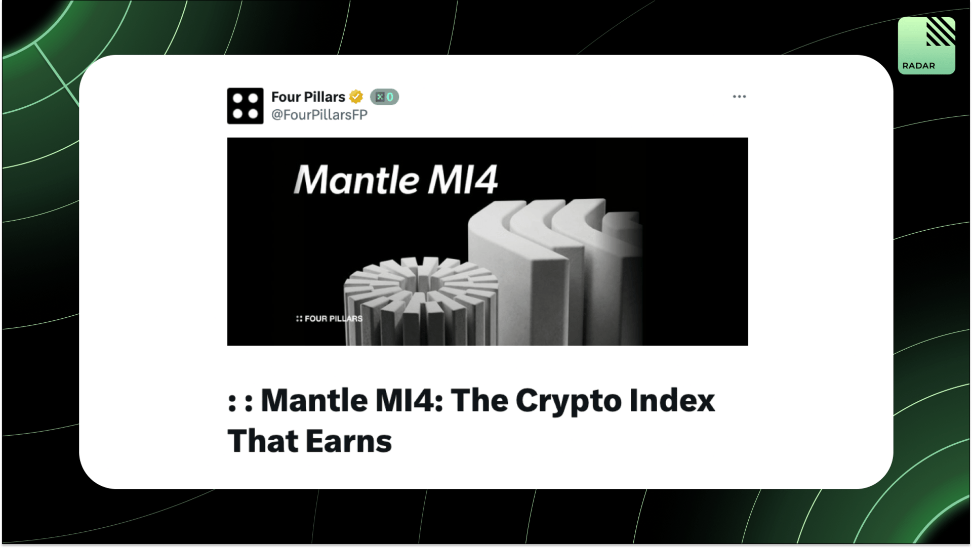 MI4 is Mantle’s tokenized fund holding BTC, ETH, SOL, and stables via yield-bearing assets like mETH and sUSDe. It’s audited, KYC-gated, and backed by $400M from the Treasury. An index fund built for institutions.