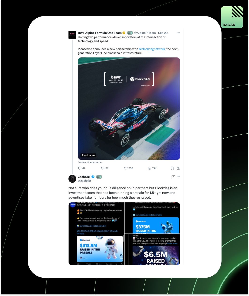BlockDAG went from $6.5M to $413M in “presale” raises over 1.5 years, now partnering with Alpine F1. ZachXBT has raised concerns, alleging inflated numbers and potential investor deception. Endless presale, zero transparency, and partners not doing basic due diligence.