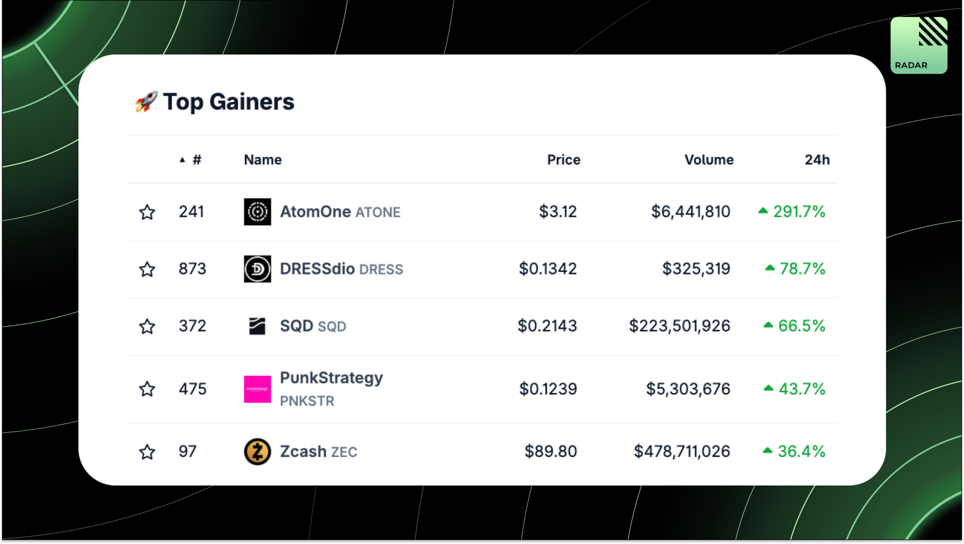 Top Gainers: ATONE, DRESS, SQD, PNKSTR, ZEC.