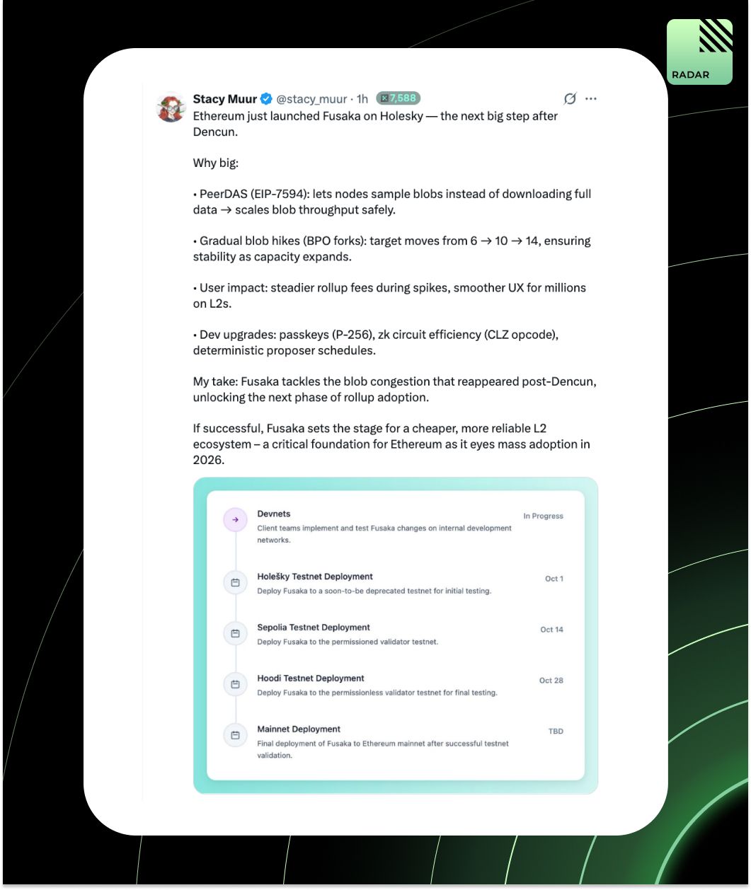 Fusaka just hit Holesky, marking one of Ethereum’s first testnet implementations post-Dencun. It brings PeerDAS (EIP-7594) for scalable blob sampling, gradual blob hikes (6 to 10 to 14), and smoother rollup fees. This will lay the groundwork for a cheaper, more reliable L2 UX.