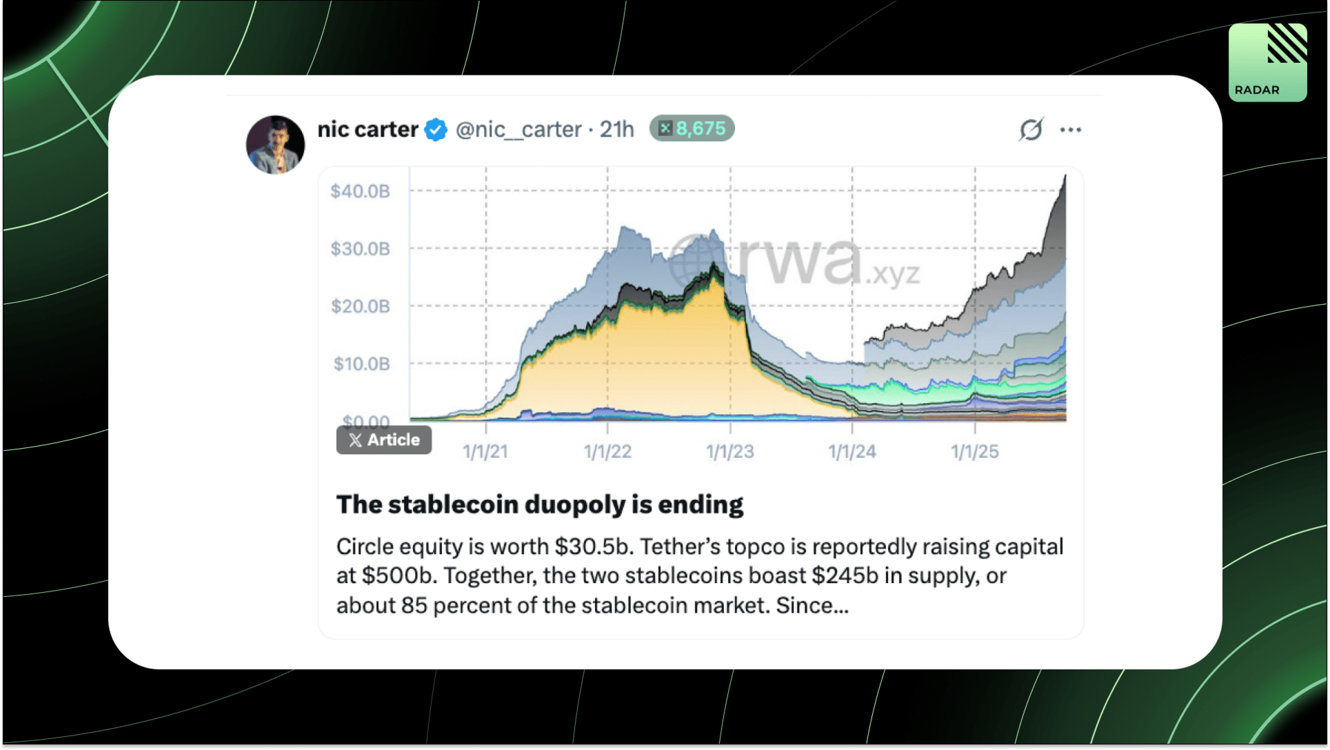 Tether & Circle’s dominance is slipping. Their market share fell from 91.6% to 86% as float-seeking apps and embedded stables (e.g., USDe, PYUSD, USDH) gain ground. Stablecoin wars now hinge on yield capture and distribution edge.