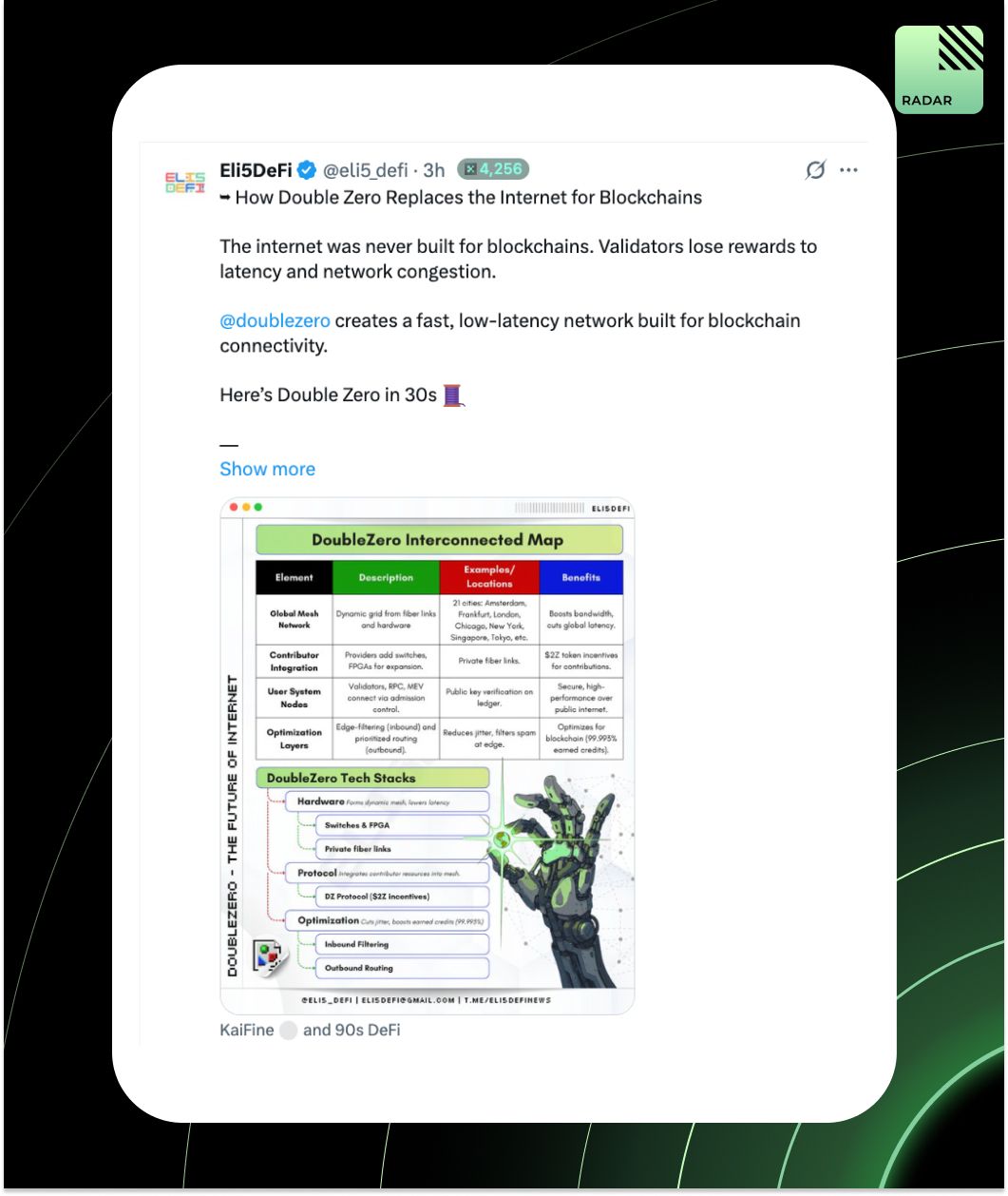 DoubleZero replaces the public internet for validators with a private mesh network of fiber links, spam filters, and optimized routing. Backed by 300+ validators and live with 2Z on Solana, it offers faster block propagation and verifiable performance.