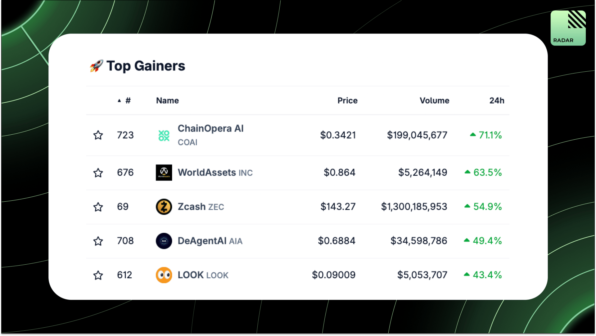 Top Gainers: COAI, INC, ZEC, AIA, LOOK.