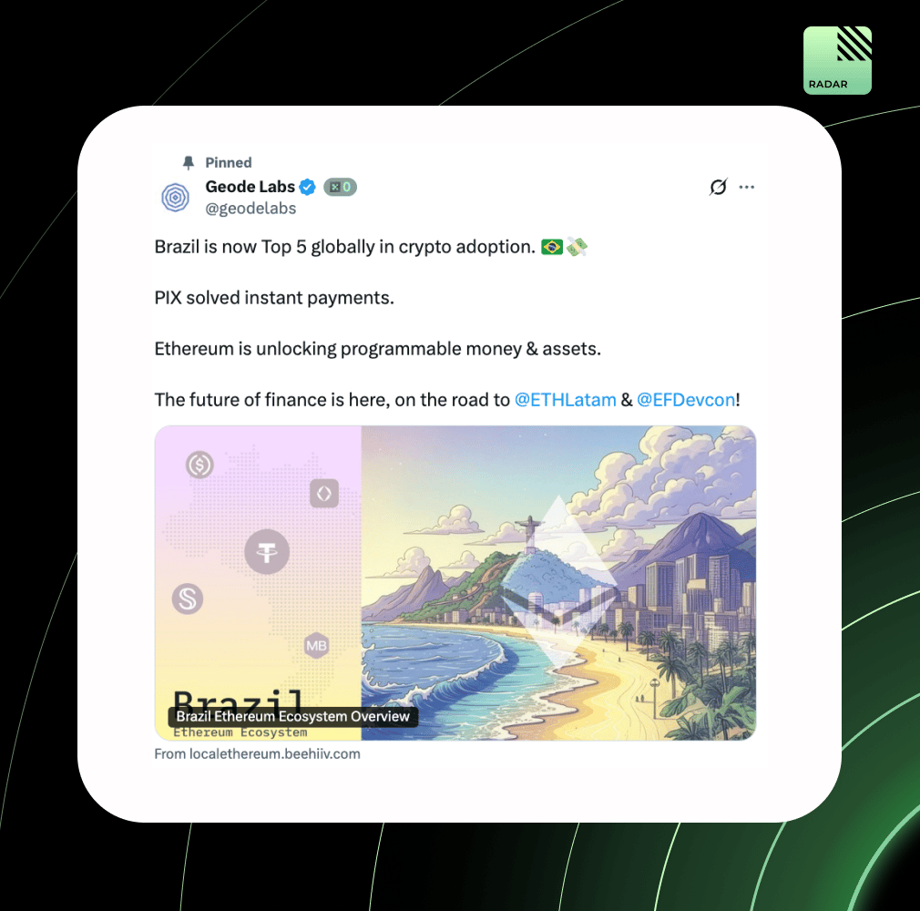 Brazil’s ETH stack is quietly blooming. From Drex pilots to PIX-native fintechs, the country blends infra, adoption, and grassroots devs, making it one of the few regions scaling both policy and product on-chain.