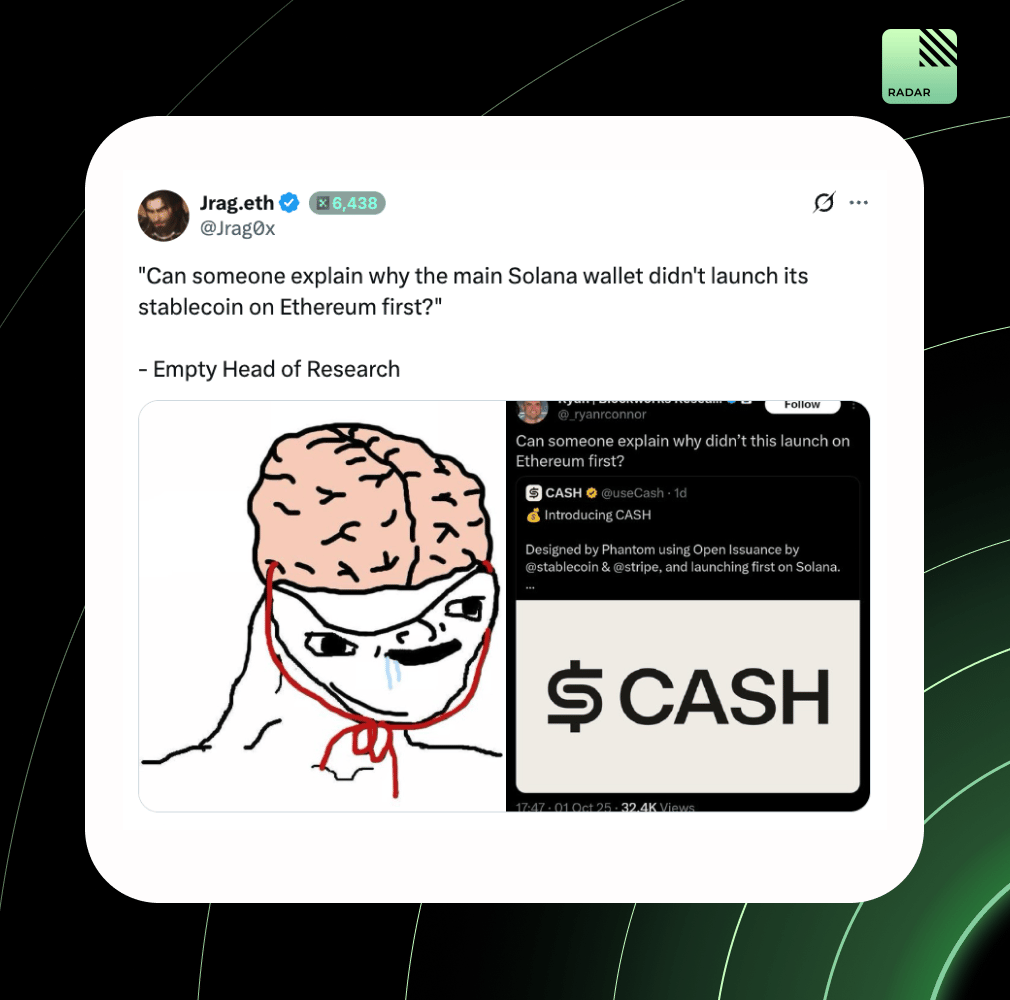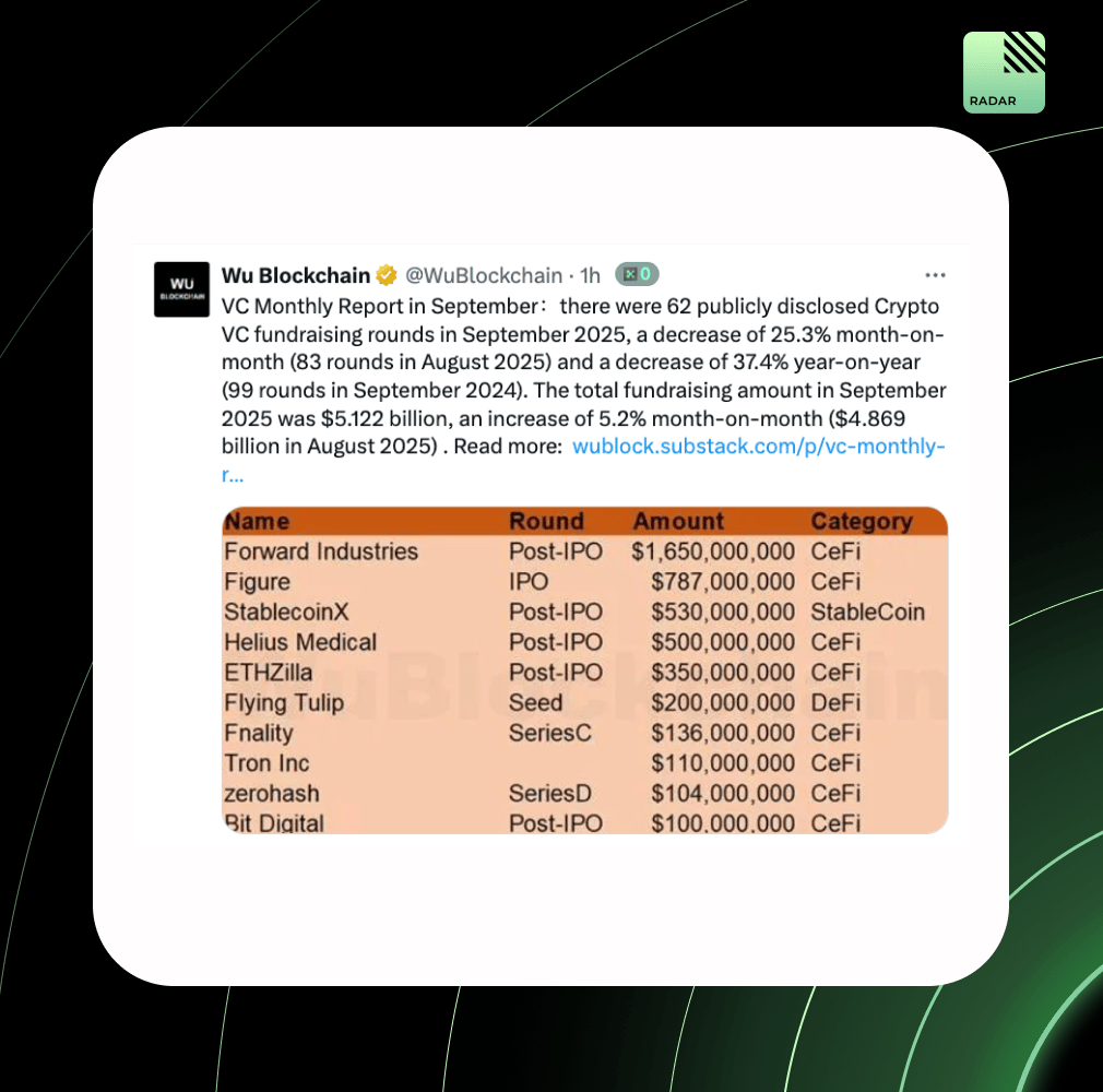 Crypto VCs slowed down in Sept: 62 rounds (–25% MoM), but $5.12B raised (+5% MoM, +739% YoY). Capital concentrated in mega PIPEs (Ford, Helius), ETH/SOL treasury plays, and RWA infra (Fnality, Zerohash). Despite fewer rounds, the bet is on scale.