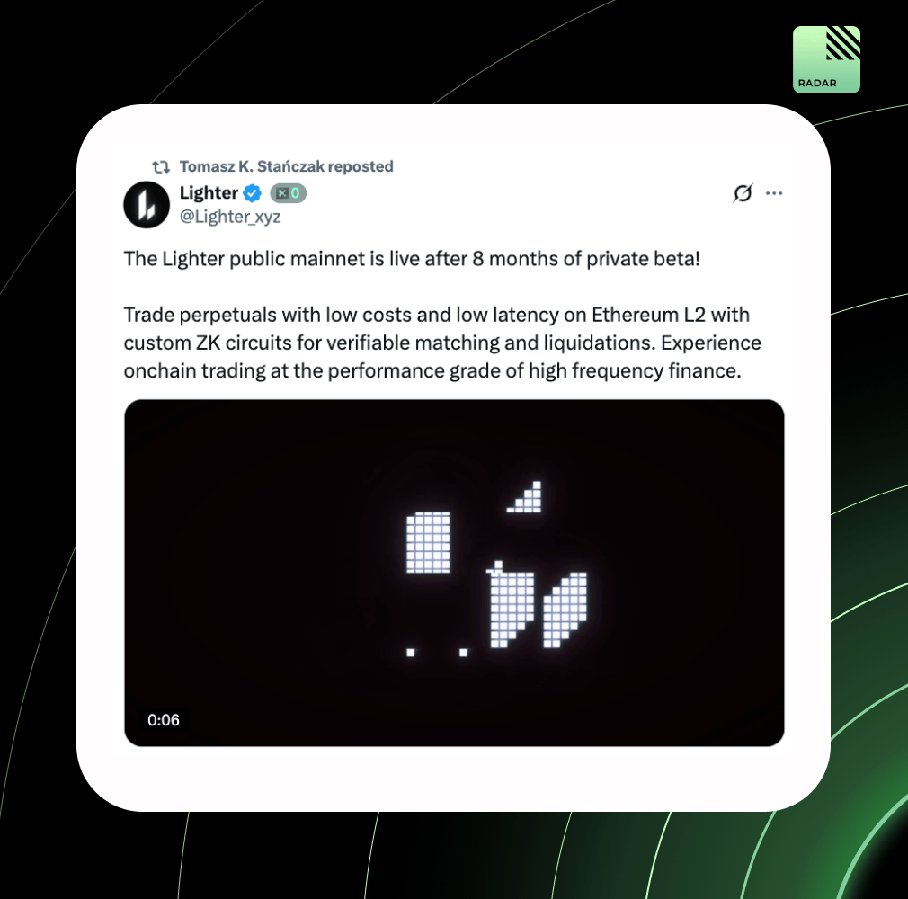 Lighter’s public mainnet is live after 8 months of testing. Users can now trade perps on an Ethereum L2 built with custom ZK circuits for verifiable matching and liquidation. Points Season 2 has also begun.