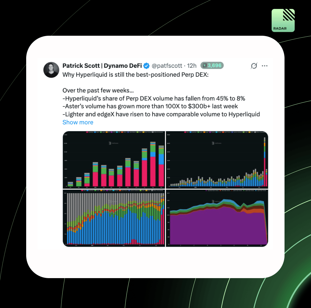Despite Aster’s explosive 100x volume growth and market share dominance, Hype remains strongest on fundamentals, leading in Open Interest (62%), growing revenue steadily, and expanding into DeFi infra (USDH, HyperEVM, HIP-3) with sticky usage beyond incentives.