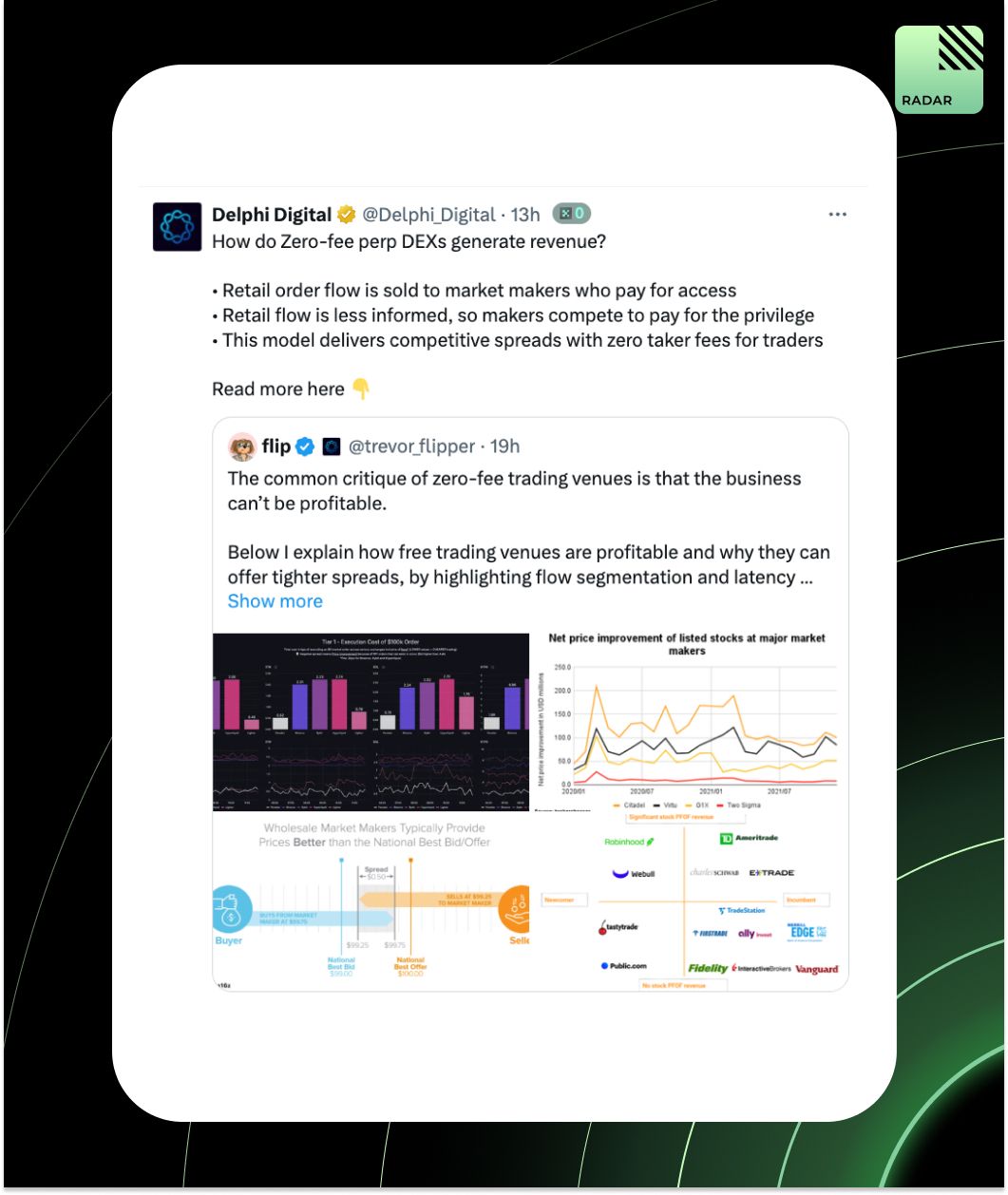 Zero-fee perp DEXs like Lighter & Paradex flip the model: makers effectively pay for order flow, rewarding clean fills. This unlocks Binance-tier spreads, beats CeFi on execution cost, and scales without taker fees or rebates.