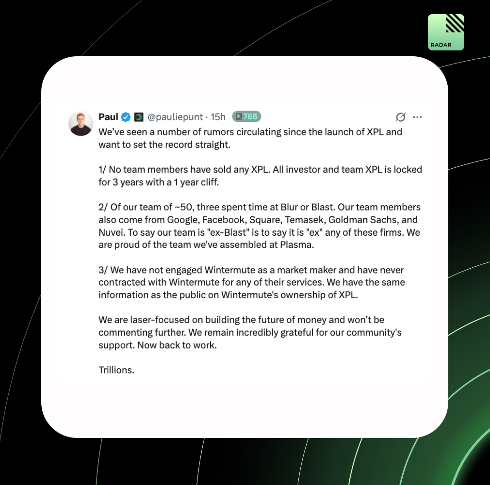 Plasma denied insider token sales, clarified that only 3 of 50 team members are ex-Blast, and stated they’ve never engaged Wintermute as a market maker. The team reaffirmed its focus on building and declined to comment further amid growing community backlash.