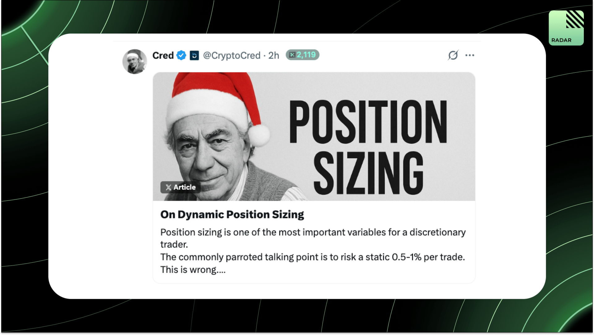 Fixed risk per trade assumes all setups are equal, but they are not. Most trades won’t move your PnL, but rare high-expectancy trades will. Size down to stay sharp, but when the moment comes, size up. That’s how you compound edge over time.