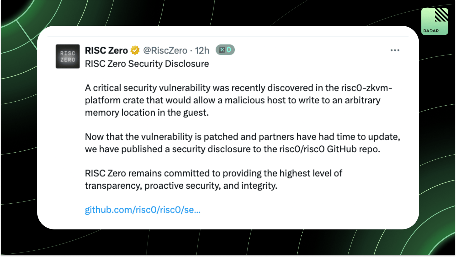 RISC Zero patched a critical vulnerability that let malicious hosts write to arbitrary guest memory. The issue affected risc0-zkvm-platform; a full security disclosure is now live after giving partners time to update.
