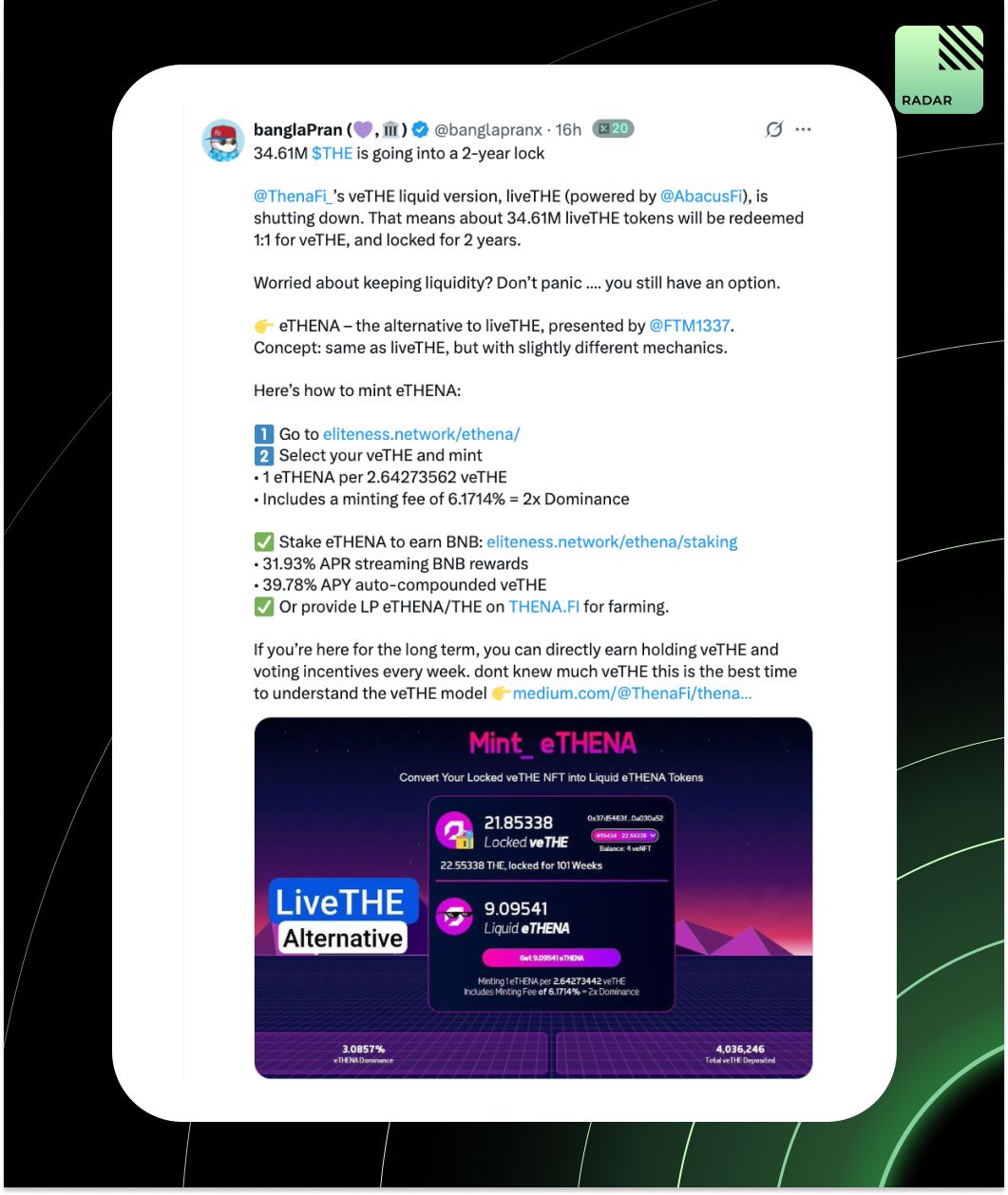 Thena is shutting down liveTHE, locking 34.61M THE into veTHE for two years. Users can pivot to eTHENA, a liquid veTHE alternative with 31.93% APR in BNB or other LP options.