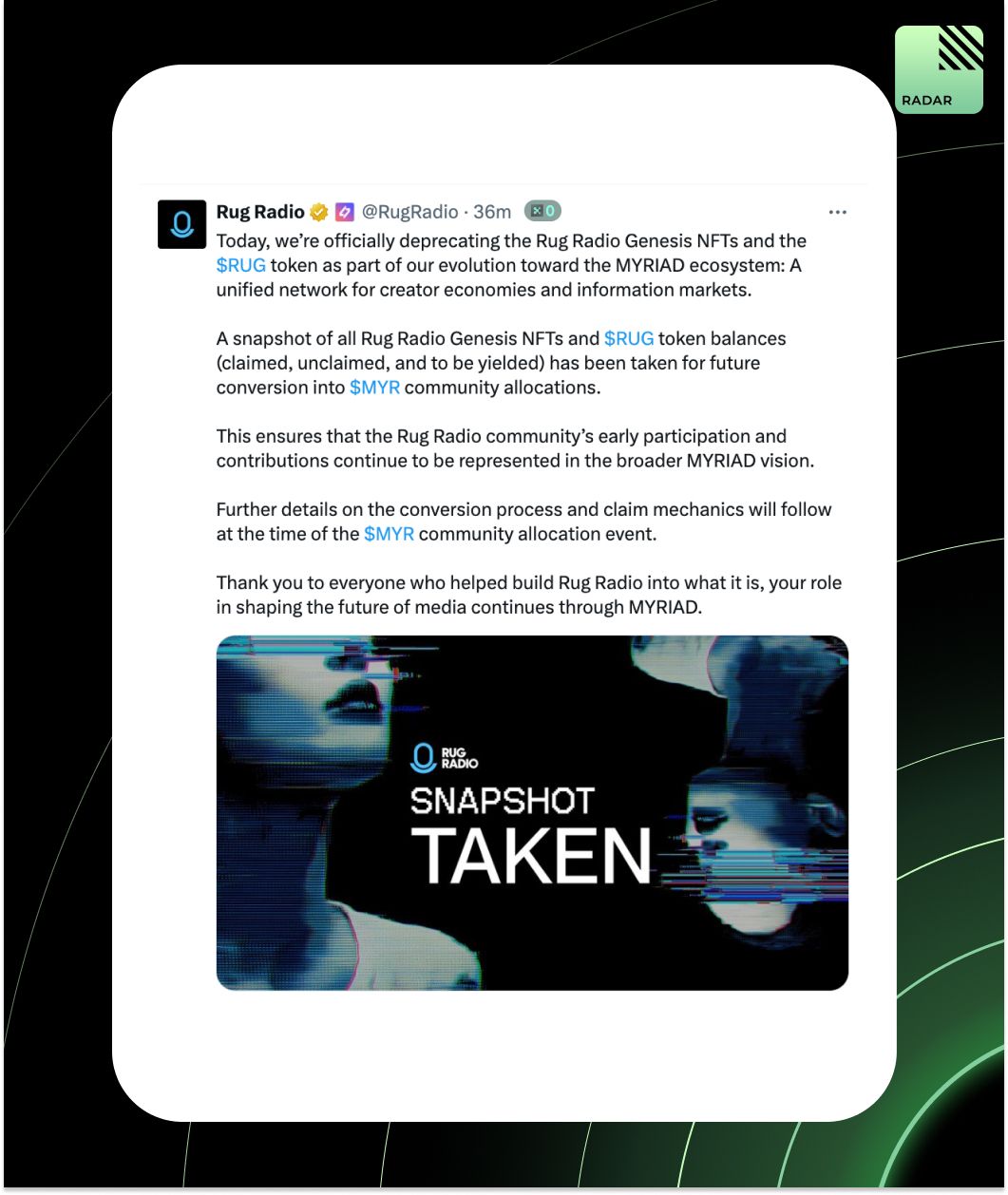 Rug Radio is sunsetting its Genesis NFTs and RUG token as it transitions to the MYRIAD ecosystem. A snapshot has been taken for future MYR allocations, ensuring early contributors are included in the next phase focused on creator economies and info markets.
