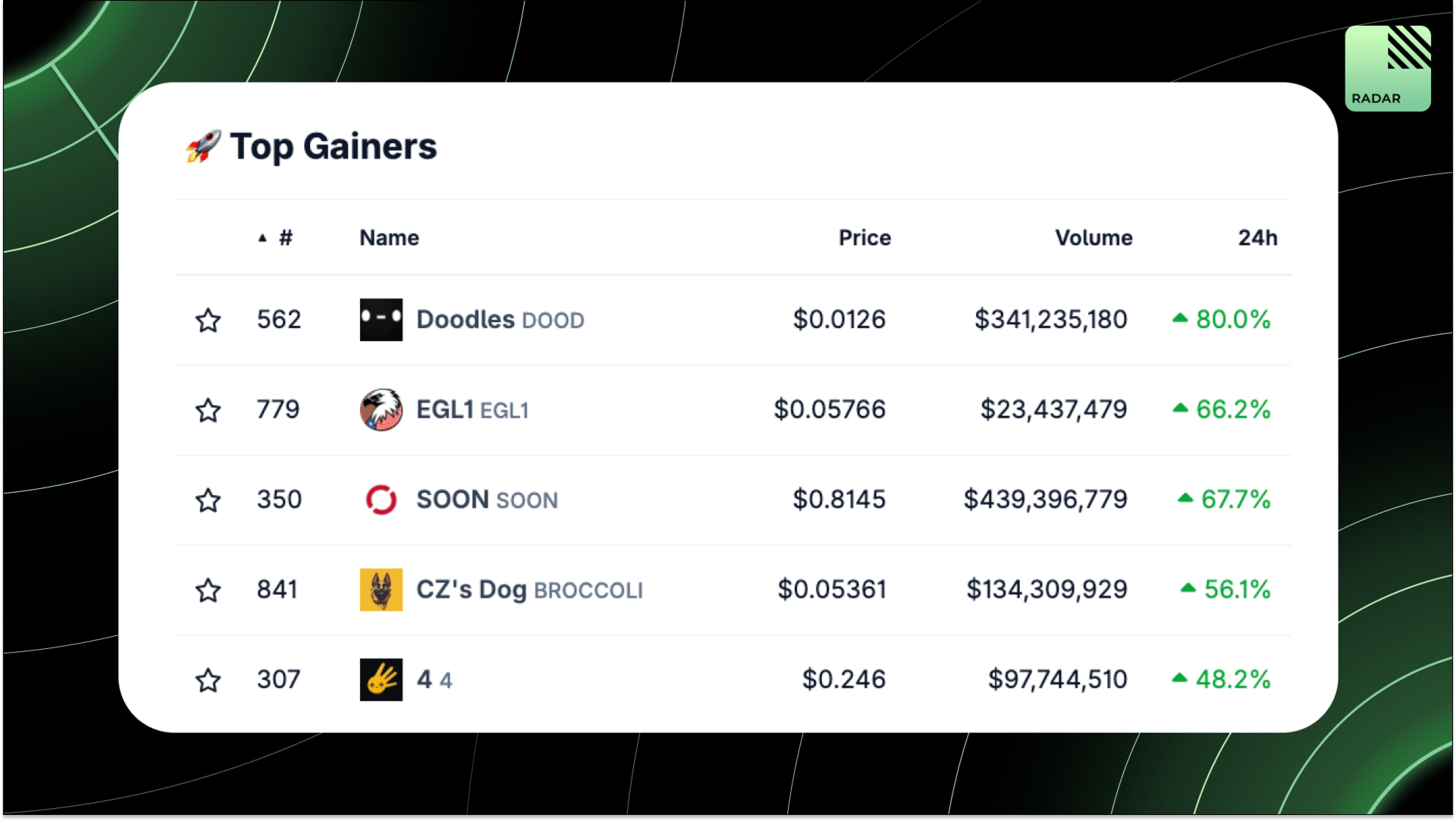 Top Gainers: DOOD, EGL1, SOON, BROCCOLI, 4.