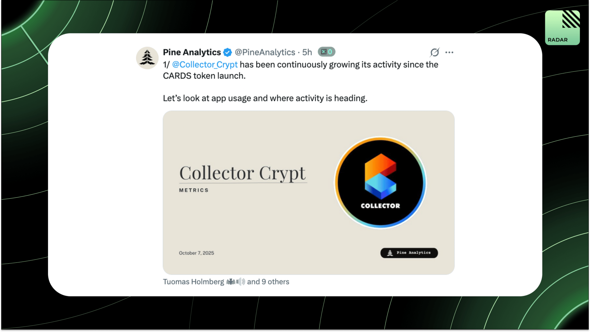 Collector Crypt has tokenized 53K+ cards and seen $124M spent on gacha packs by ~7K wallets. Activity is rising, with normal packs driving ~64% of volume. CARDS launch spiked NFT trading to $848K, though volumes have since cooled.