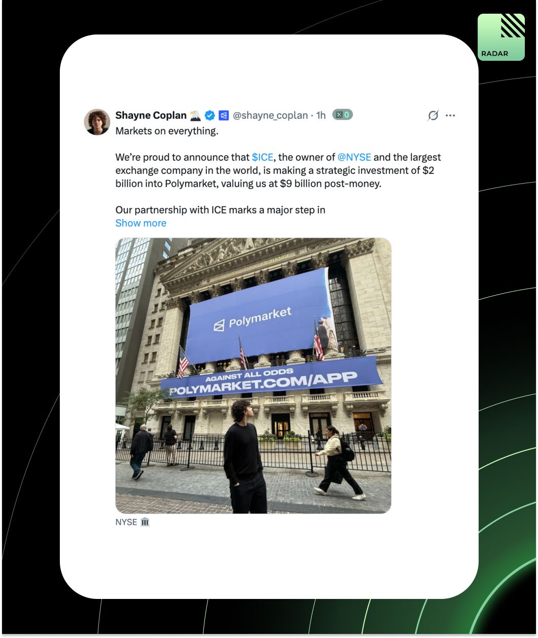 Polymarket just raised a $2B strategic investment from ICE (owner of NYSE), valuing it at $9B. ICE will distribute Polymarket data to financial institutions globally, marking the biggest prediction market validation to date.