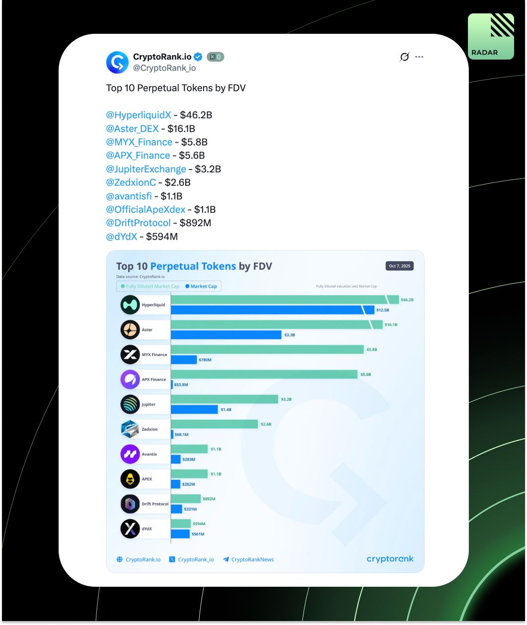 Perp DEXs are booming, and Hyperliquid’s $46.2B FDV dwarfs the rest. Aster, MYX, and APX trail far behind, while OGs like dYdX now sit under $600M. New players are commanding outsized valuations in the on-chain derivatives race.