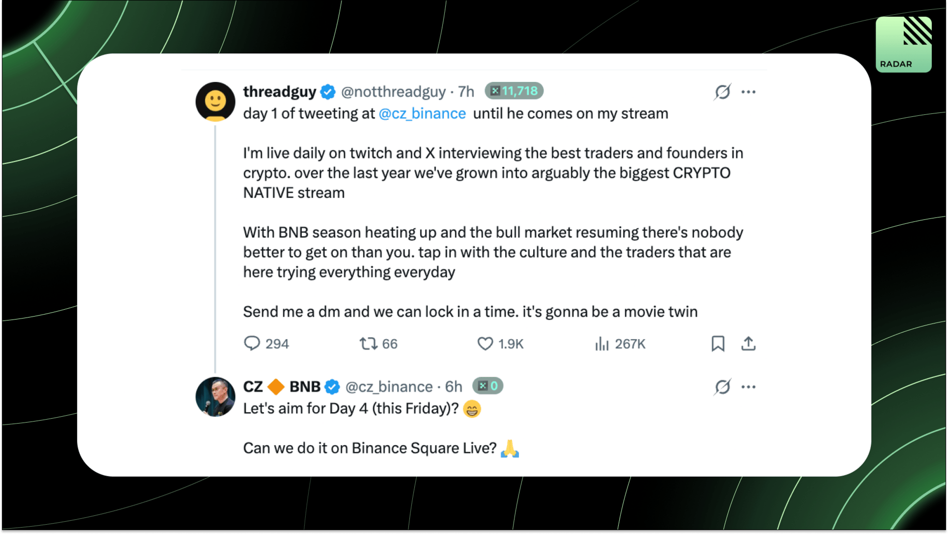 CZ agrees to join Threadguy on Binance Square Live on Friday.