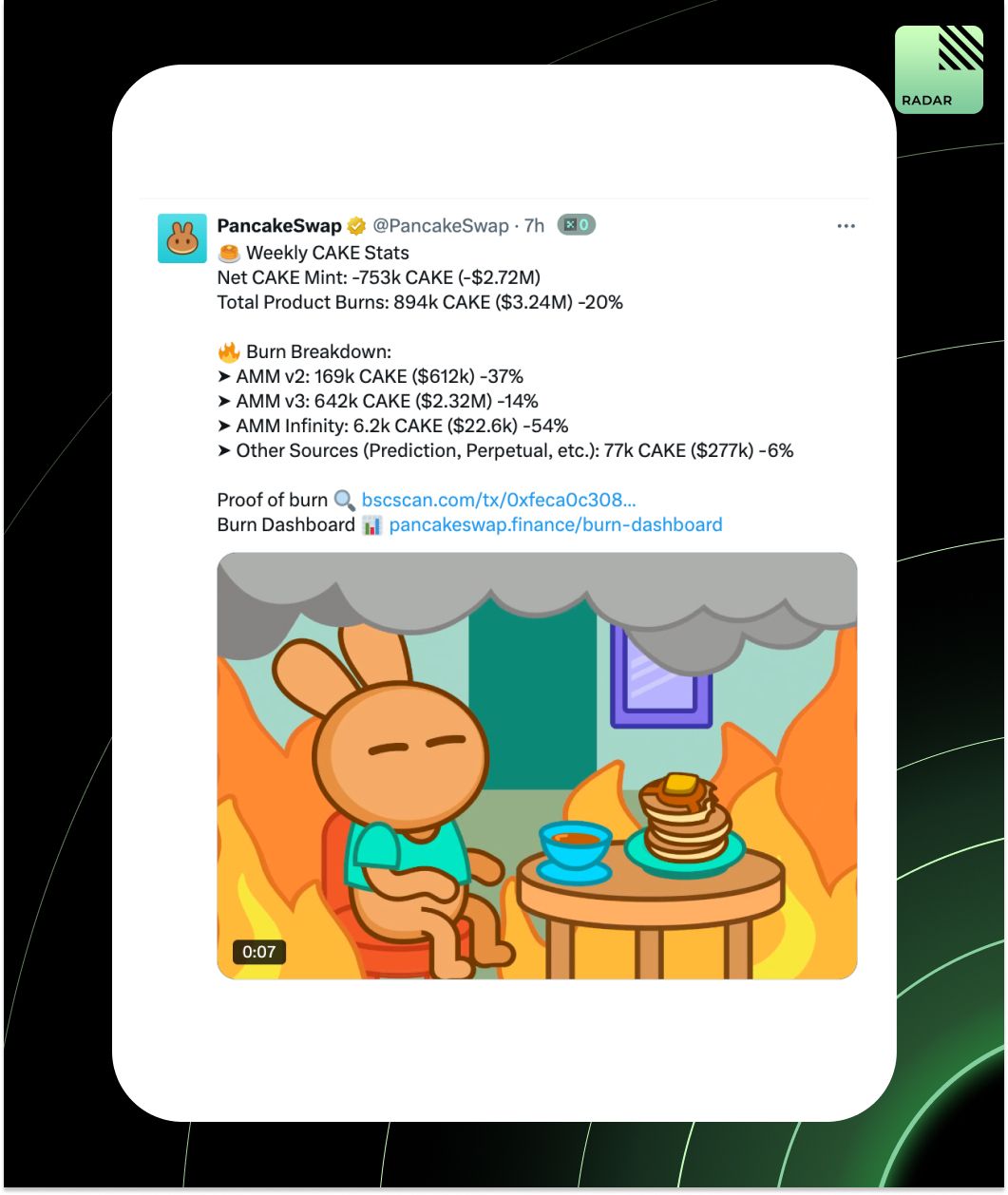 PancakeSwap burned 894k CAKE ($3.24M) this week, outpacing minting by 753k CAKE. While AMM v3 led with $2.32M in burns, all segments saw declines; AMM v2 dropped 37%, AMM Infinity 54%.