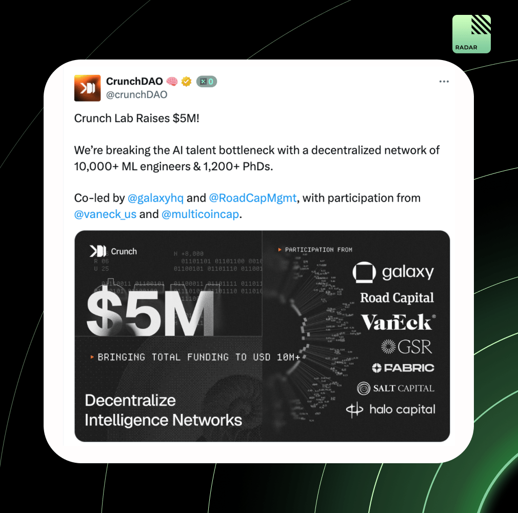CrunchDAO raised $5M to scale Crunch Lab, a decentralized network of 10K+ ML engineers and 1.2K+ PhDs. Backed by Galaxy, Road Capital, Multicoin, and VanEck, they’re betting crowdsourced models will outcompete Big Tech’s $100M silos.