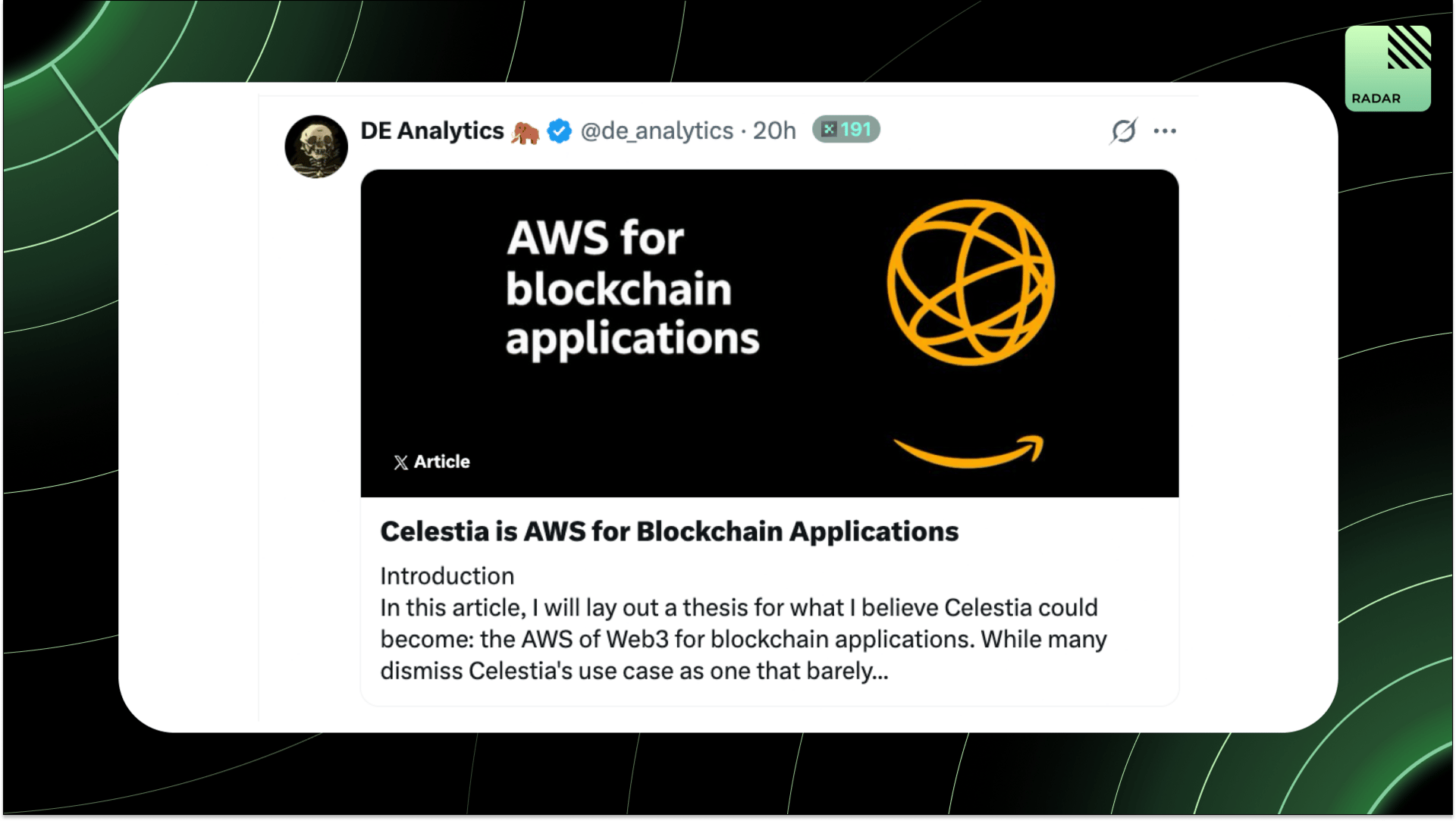 Celestia is building the AWS of modular blockchains, offering cheap, scalable blockspace as a core primitive. Like AWS, it bets infra demand will explode, and aims to capture a slice of every rollup’s growth through DA, light nodes, and shared security.