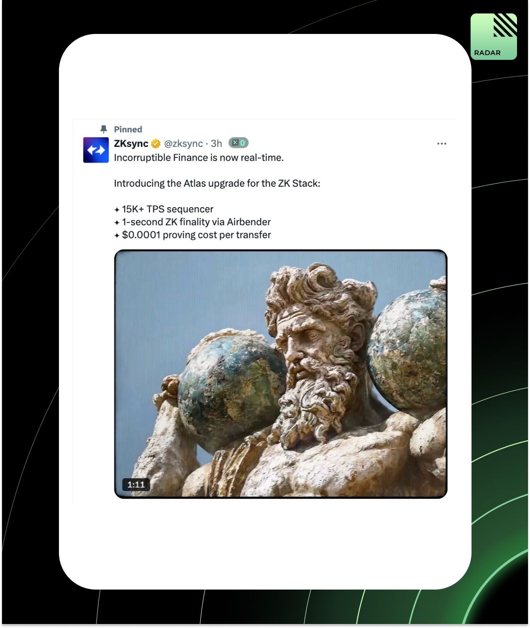 ZKsync’s Atlas upgrade delivers 15K+ TPS, 1-second ZK finality, and less than $0.0001 proof costs via Airbender. It enables fast, private, multi-chain settlement without legacy bridge bottlenecks, positioning ZKsync as the backbone for a modular ZK economy.
