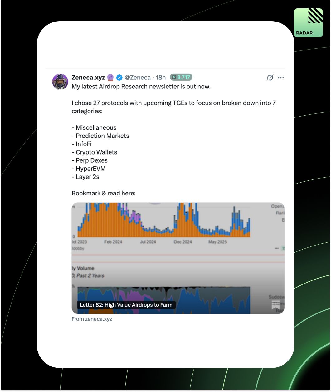 Zeneca highlights 27 airdrops to watch, split across 7 categories. Each has a TGE on the horizon; clearly, the airdrop meta isn’t cooling off.