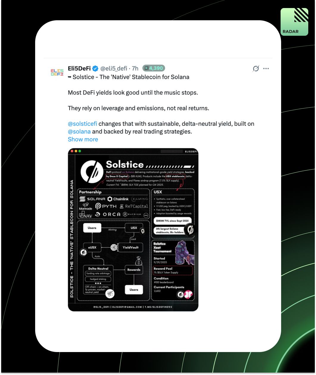 Solstice is emerging as Solana’s native stablecoin and yield layer. It’s backed by delta-neutral strategies (no emissions), already has $180M+ TVL, and is running a Flares airdrop, Xeet campaign with 1% SLX supply for early users and creators. SLX TGE expected Q4 2025.