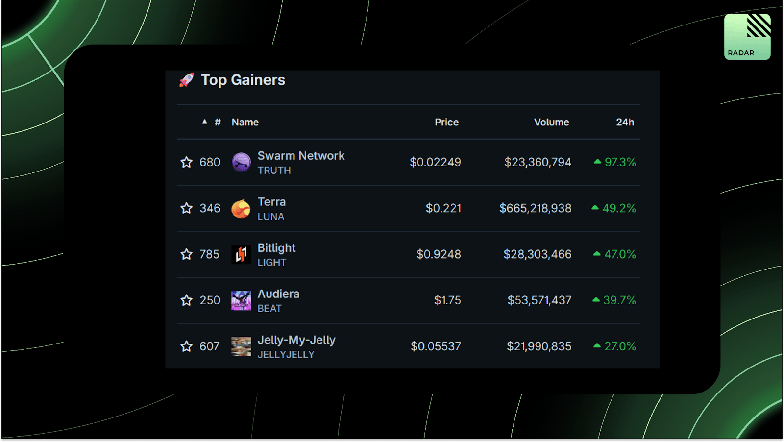 Top gainers: TRUTH, LUNA, LIGHT, BEAT, JELLYJELLY