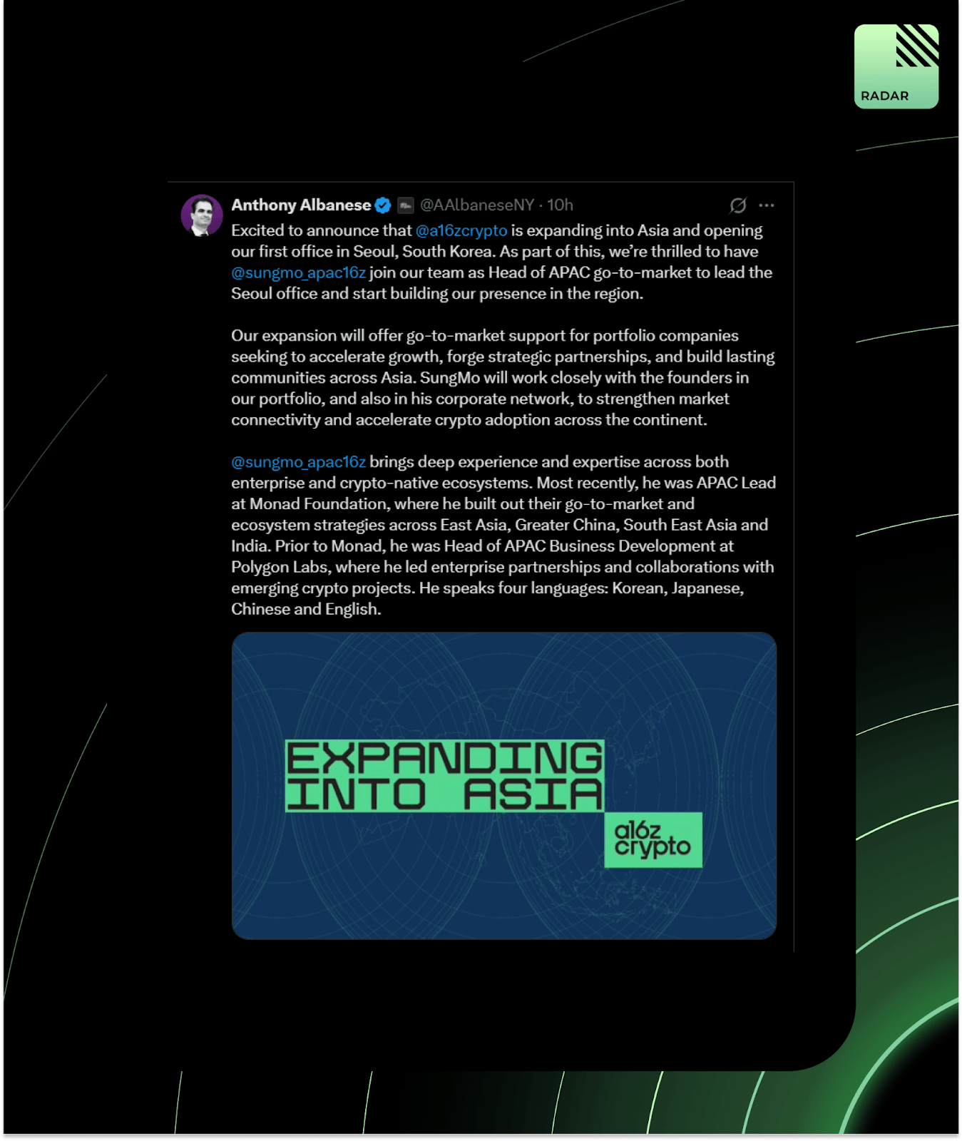 a16z crypto is expanding into Asia with a Seoul office and a new APAC lead from Monad and Polygon. They’re going after founders, enterprises, and governments across the region. Asia season is heating up.