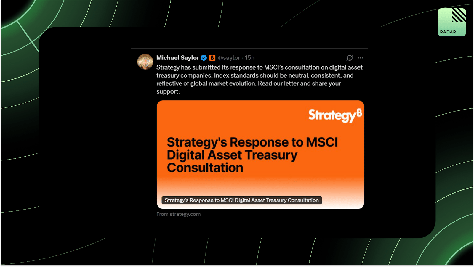 Michael Saylor says Morgan Stanley Capital International (MSCI)’s plan to cut Digital Asset Treasury (DAT) companies is anti-progress and anti-America. In other news, water is wet.