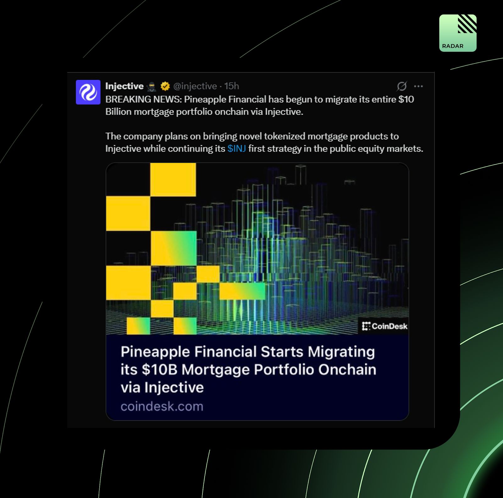 Injective just onboarded a $10B mortgage portfolio! Pineapple Financial is moving 29,000 mortgages on-chain for real-time audits, automated checks, and an upcoming marketplace for anonymized loan data.
