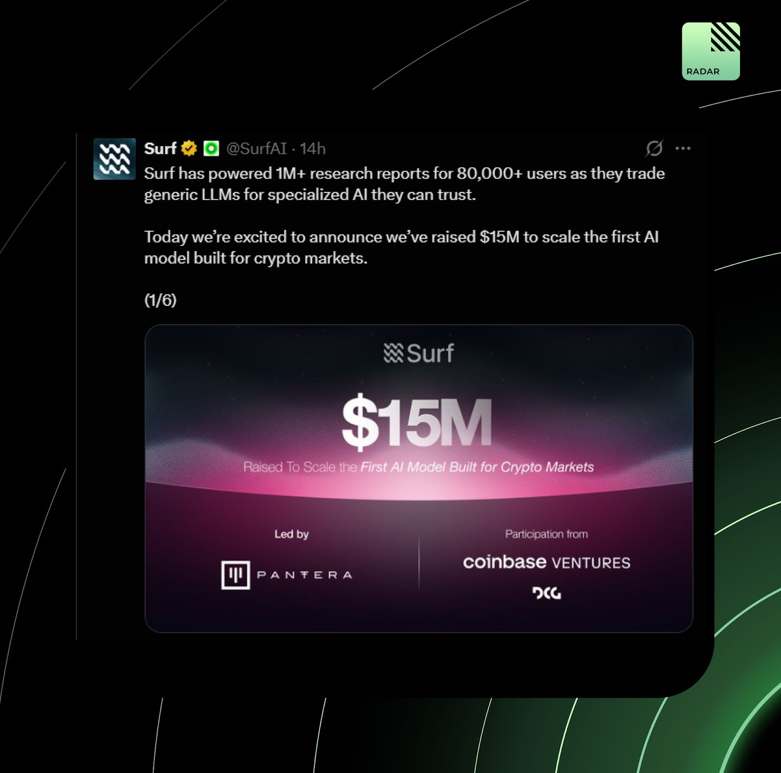 Surf raised $15M to build the AI model crypto actually needs, not another ChatGPT cosplay. After powering over 1M research reports for 80K users, Surf is building Surf 2.0 with Pantera, Coinbase Ventures, and DCG backing the mission. Generic LLMs are out. Crypto-native AI is in.