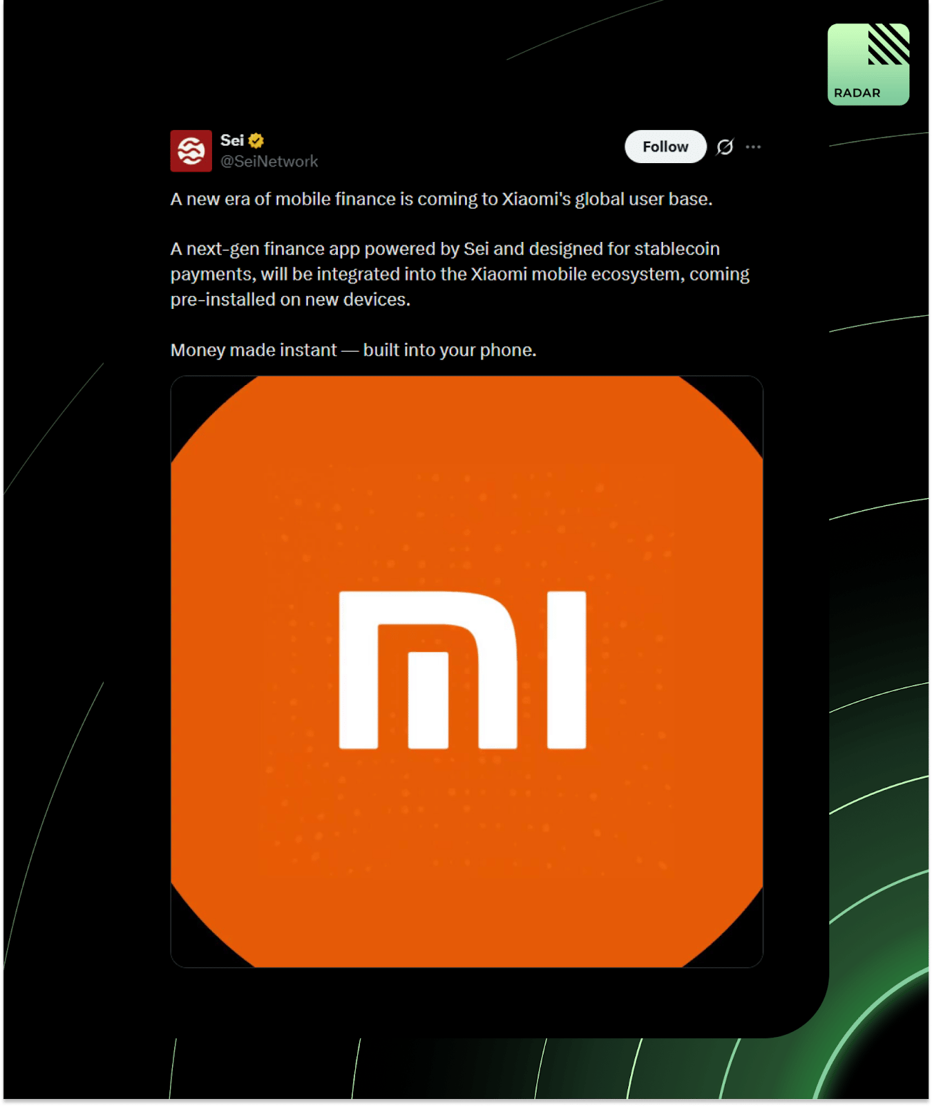 Xiaomi, the Chinese tech giant, is integrating a Sei-powered stablecoin payments app directly into its global smartphone ecosystem. Billions of devices, instant stablecoin transfers… imagine explaining this to yourself in 2020.