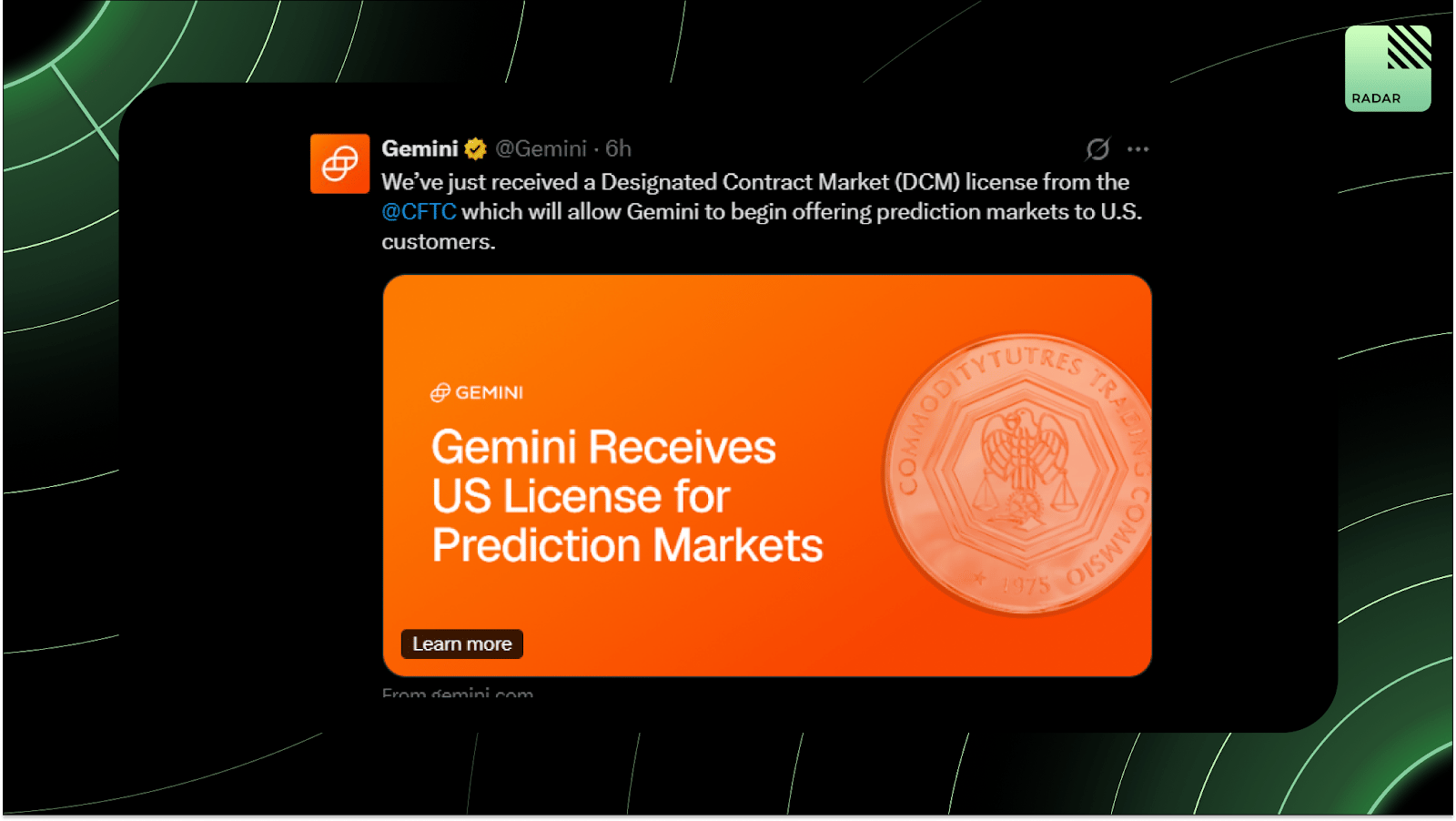 Gemini finally got its CFTC Designated Contract Market license after five years! Its prediction market is coming to the U.S., opening the door for futures, options, and perps later. Huge win for prediction markets!