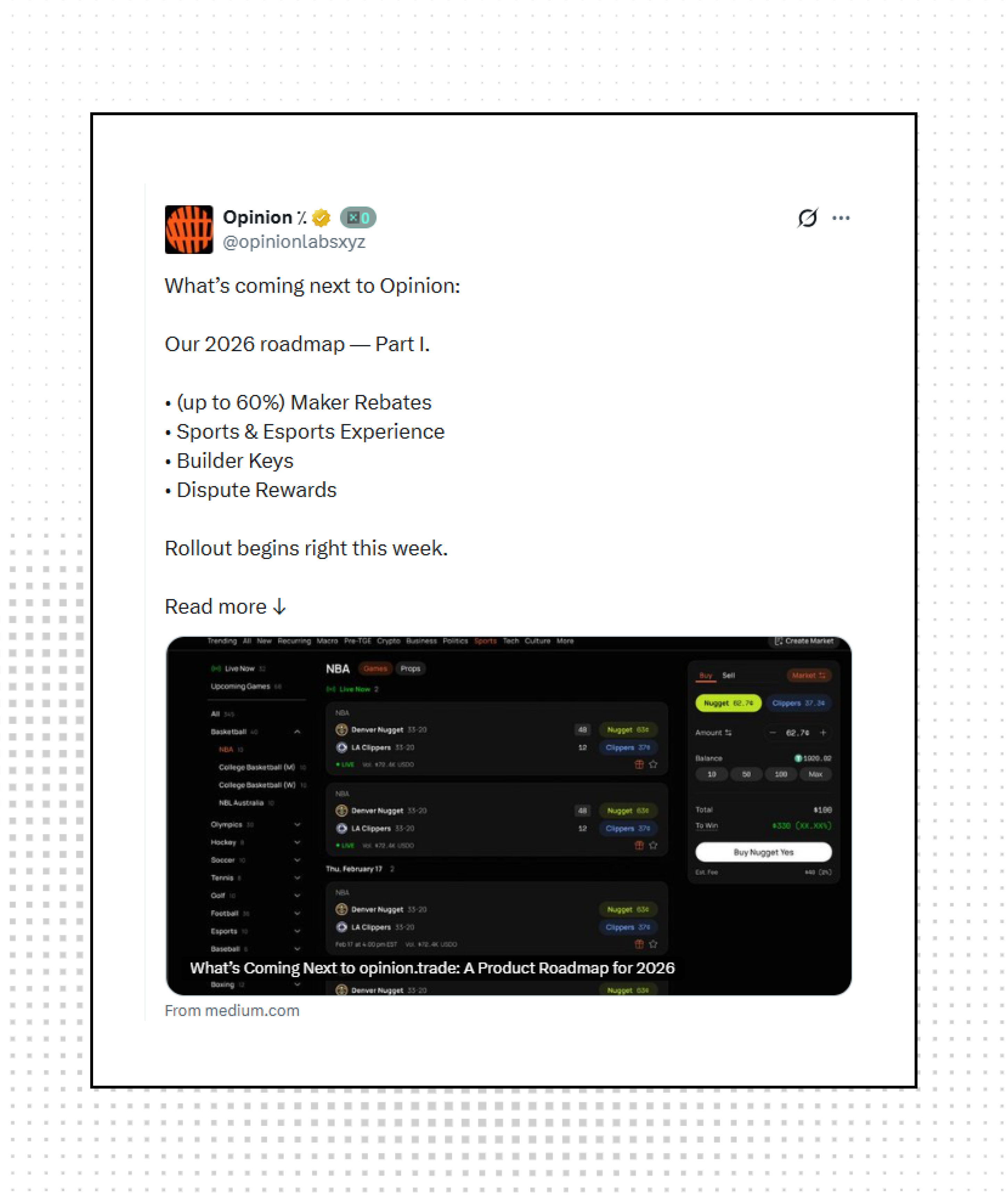 Opinion Trade unveiled their 2026 roadmap featuring up to 60% maker rebates, sports and esports markets, builder keys, and dispute rewards. Rollout begins this week as the prediction market platform positions itself for aggressive growth.