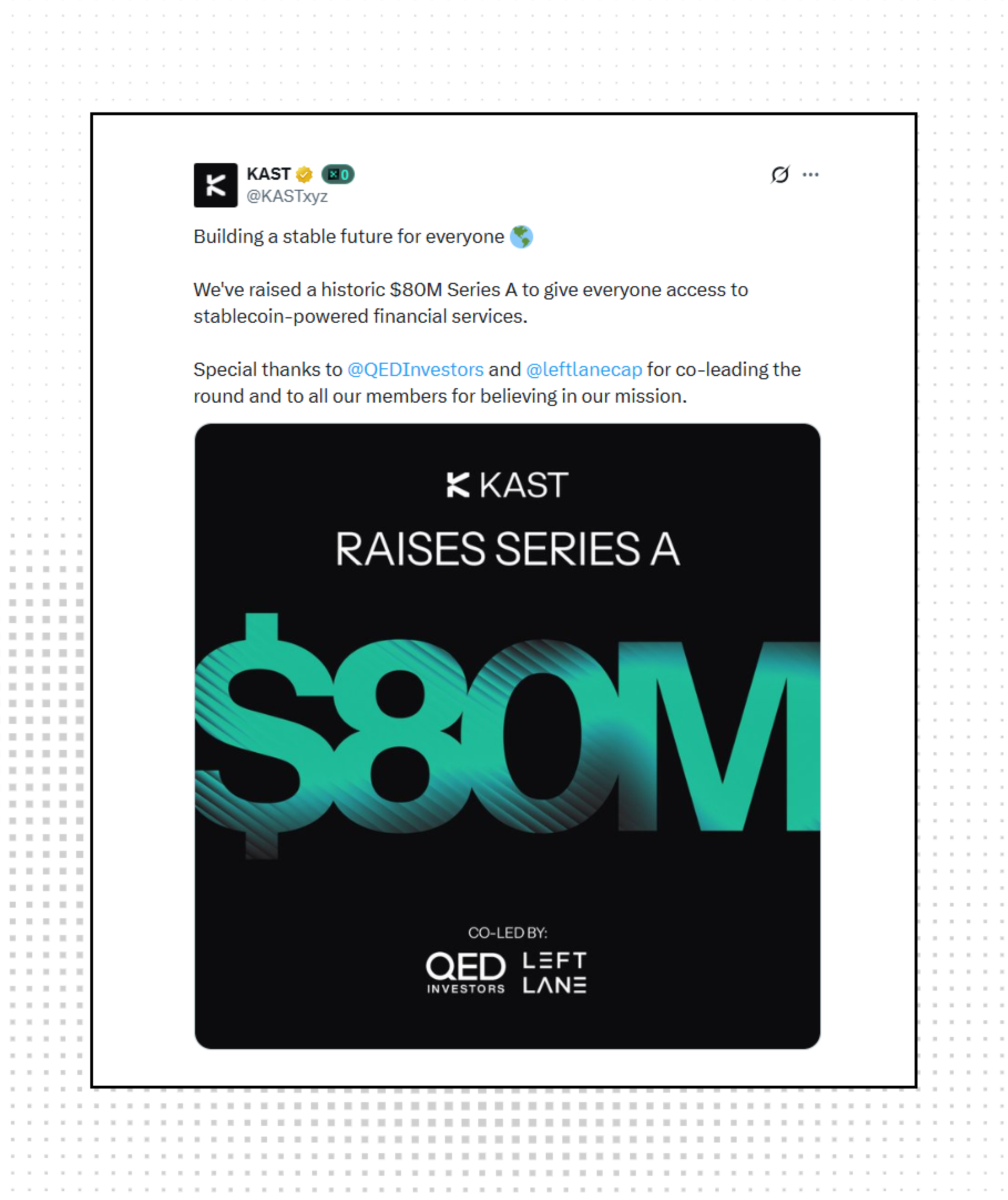 KAST closed a historic $80M Series A to bring stablecoin-powered financial services to everyone, co-led by QED Investors and Left Lane Capital. The raise signals a growing institutional appetite for stablecoin infrastructure aimed at mass adoption.