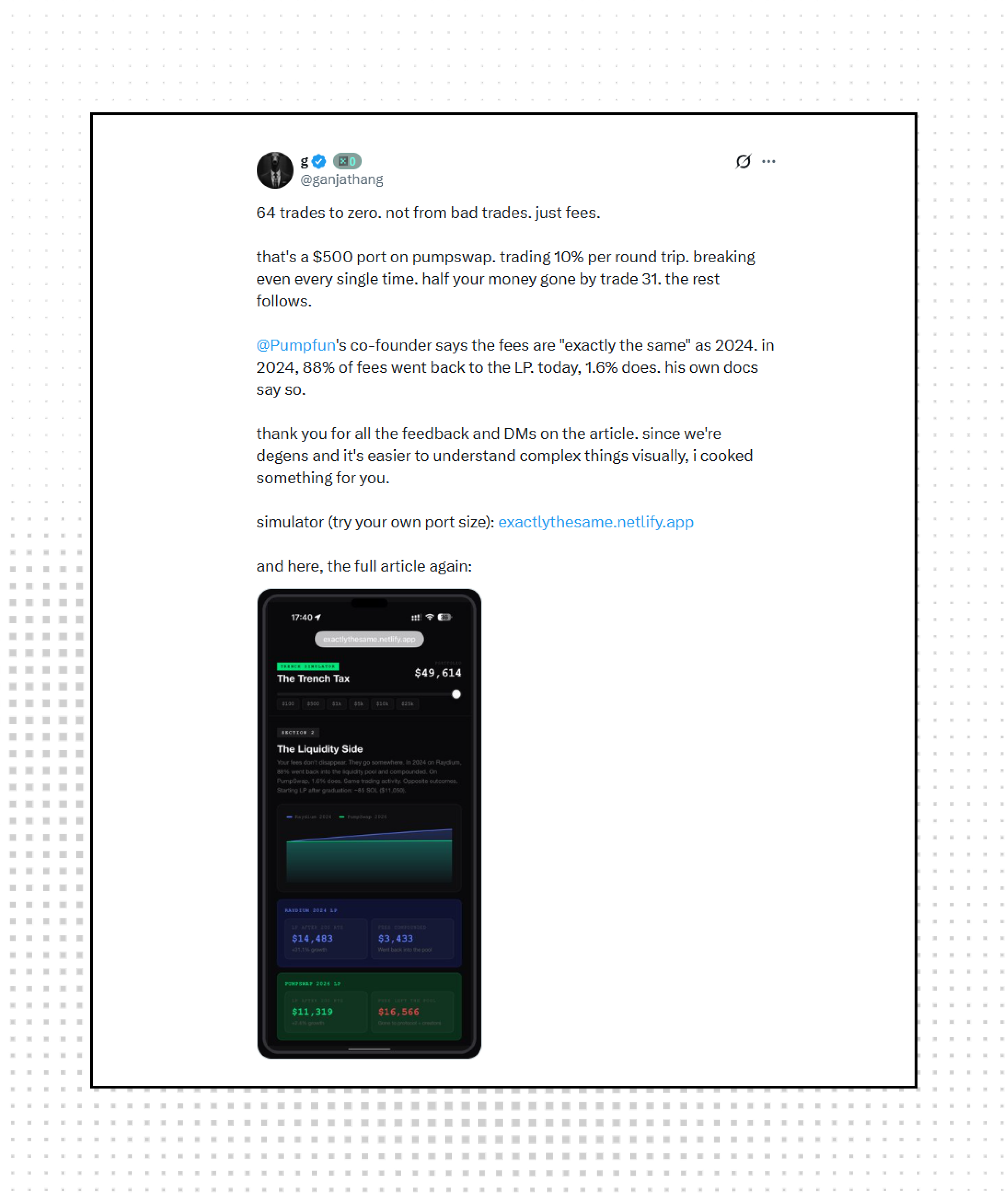Pumpswap is catching heat after analysis showed a $500 portfolio could hit zero in 64 trades just from fees alone. The co-founder claims fees are "exactly the same" as 2024, but critics point out that LP rebates dropped from 88% to 1.6%, a brutal change buried in the docs.