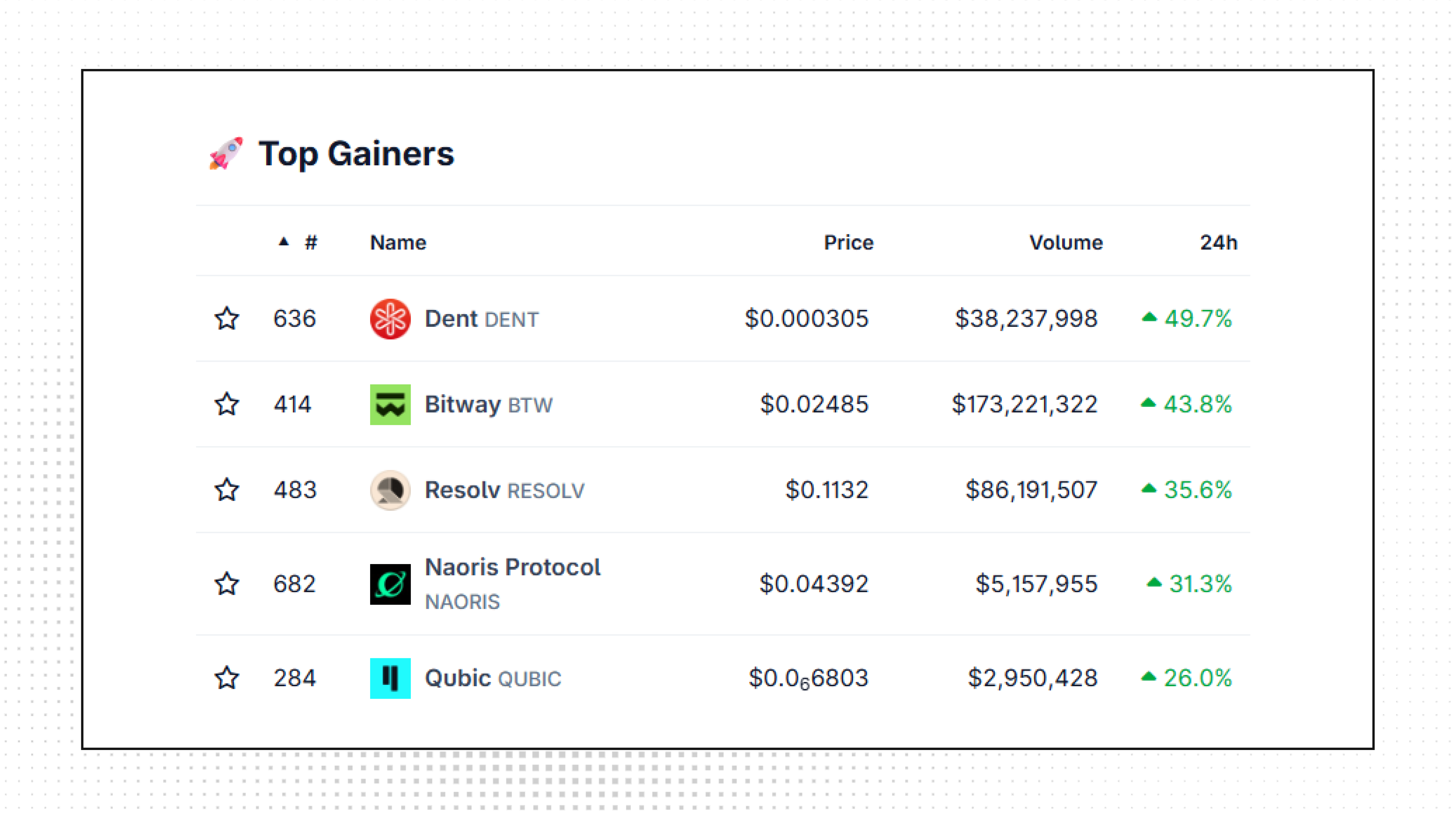 Top Gainers: DENT, BTW, RESOLV, NAORIS, QUBIC.