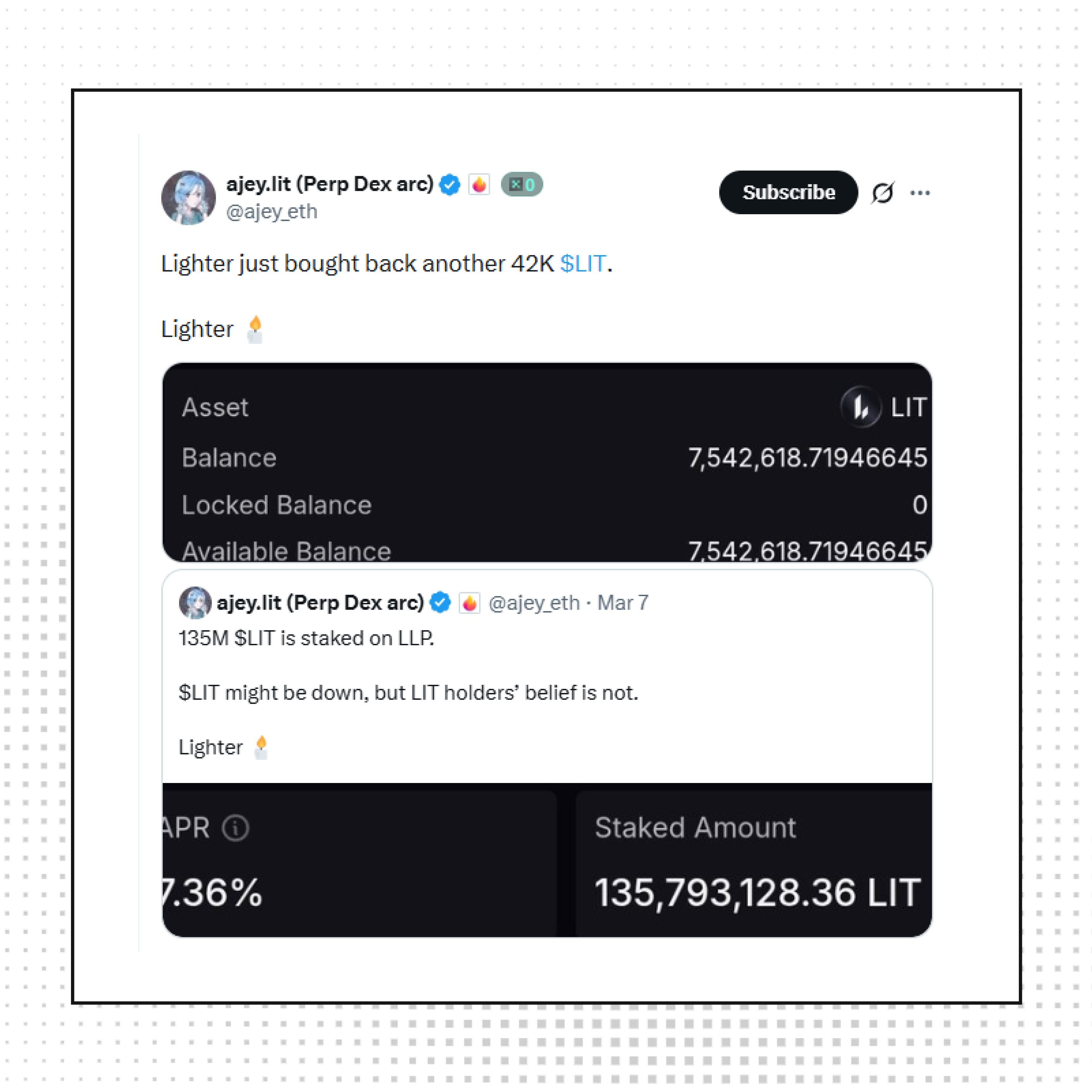 Lighter executed another buyback, scooping up 42K LIT tokens. Continued buybacks signal confidence from the team and show that the treasury is actively supporting the ecosystem rather than sitting idle.