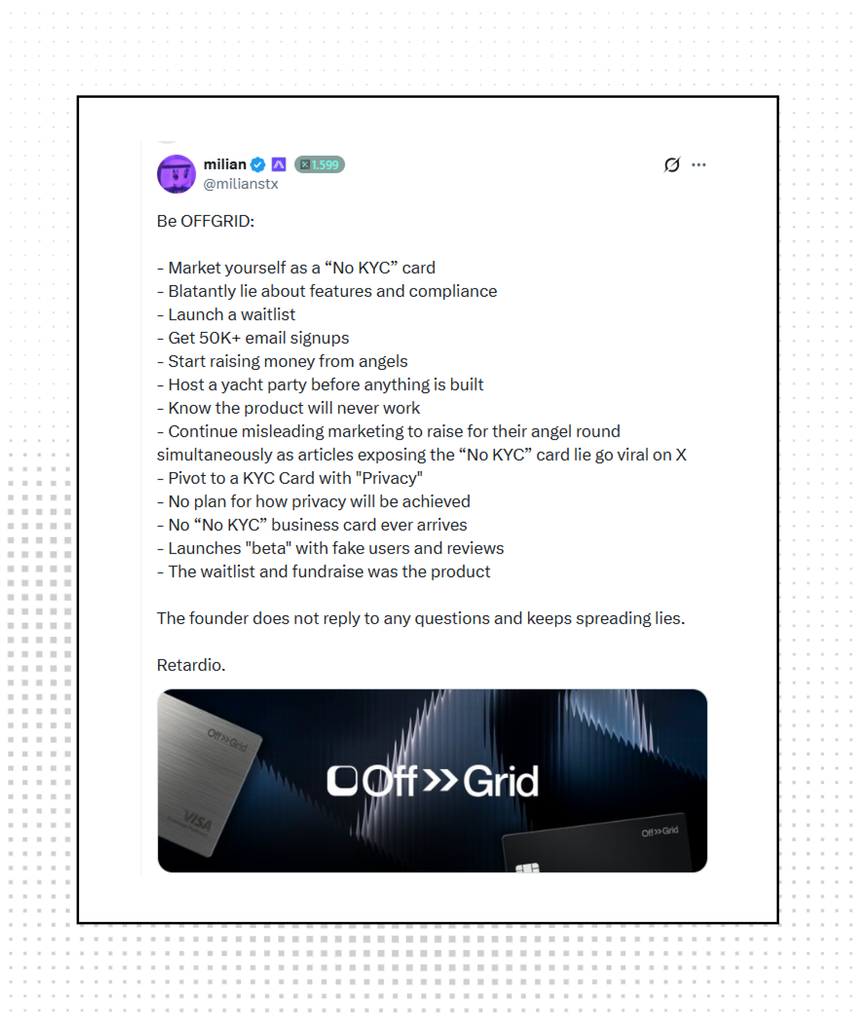 OFFGRID is getting called out hard for allegedly running a bait-and-switch scheme with their "No KYC" card. The project reportedly collected over 50K email signups, raised angel funding, and hosted yacht parties, all before pivoting to a KYC model with vague "privacy" promises.